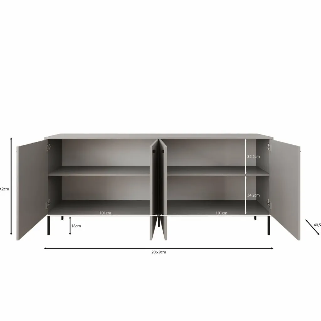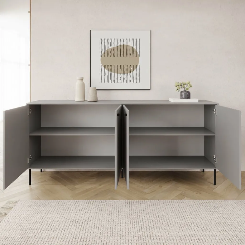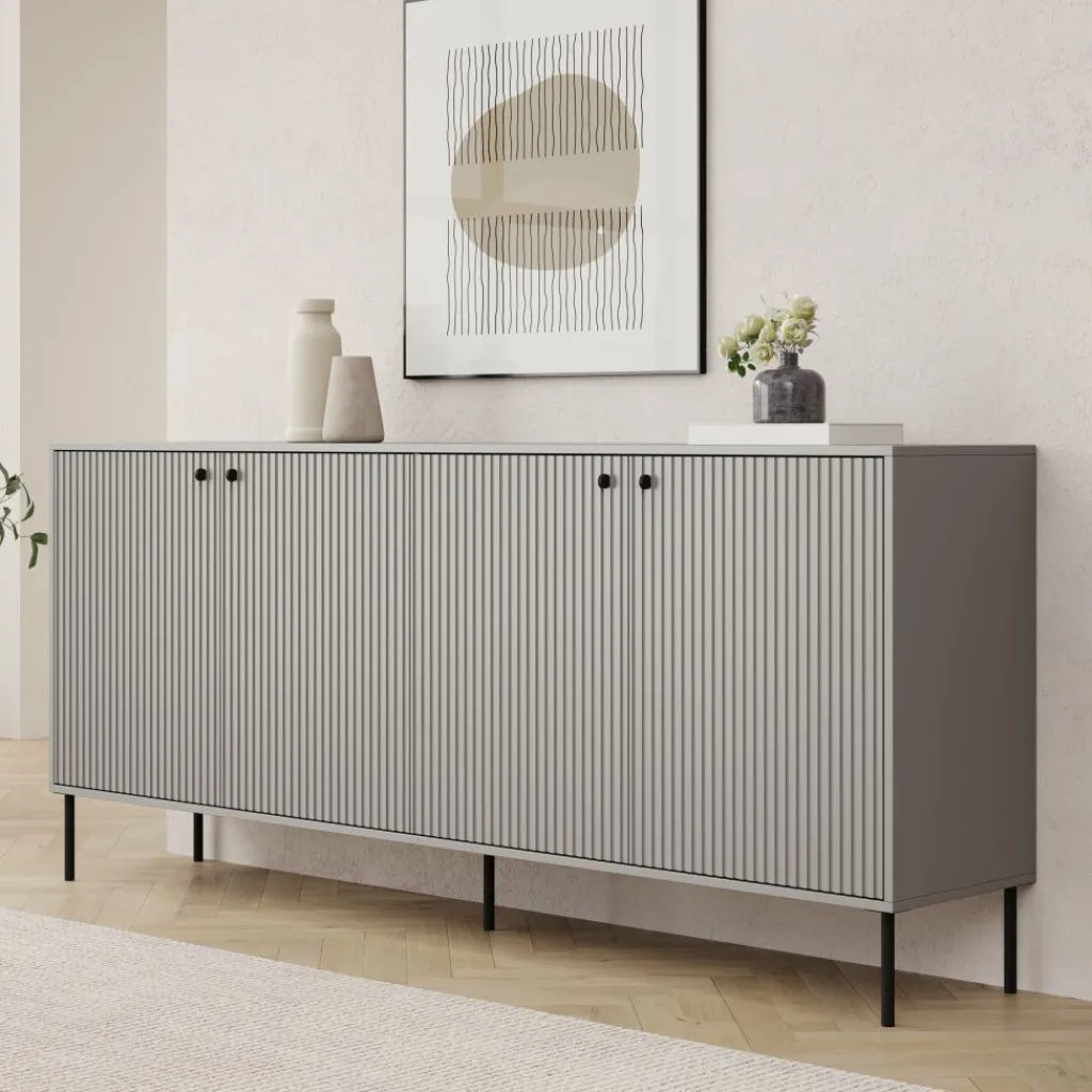 Dressoir Ilux is uitgevoerd in matgrijs en voorzien van geribbelde fronten. Het meubel van 206 cm breed biedt opbergruimte achter vier deuren.