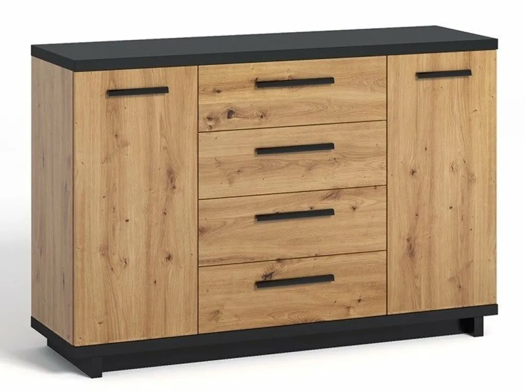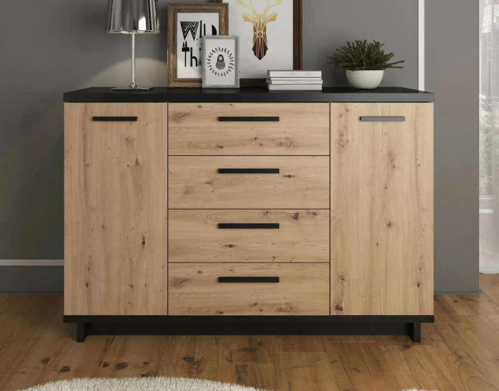 Dressoir Incala is een kast met een moderne industriële uitstraling. Het meubel is uitgevoerd in een eiken kleur met mat zwarte bovenplaat. De ladekast beschikt over 4 lades en 2 deuren. Op de deuren en lades zitten handgrepen in zwarte kleur.