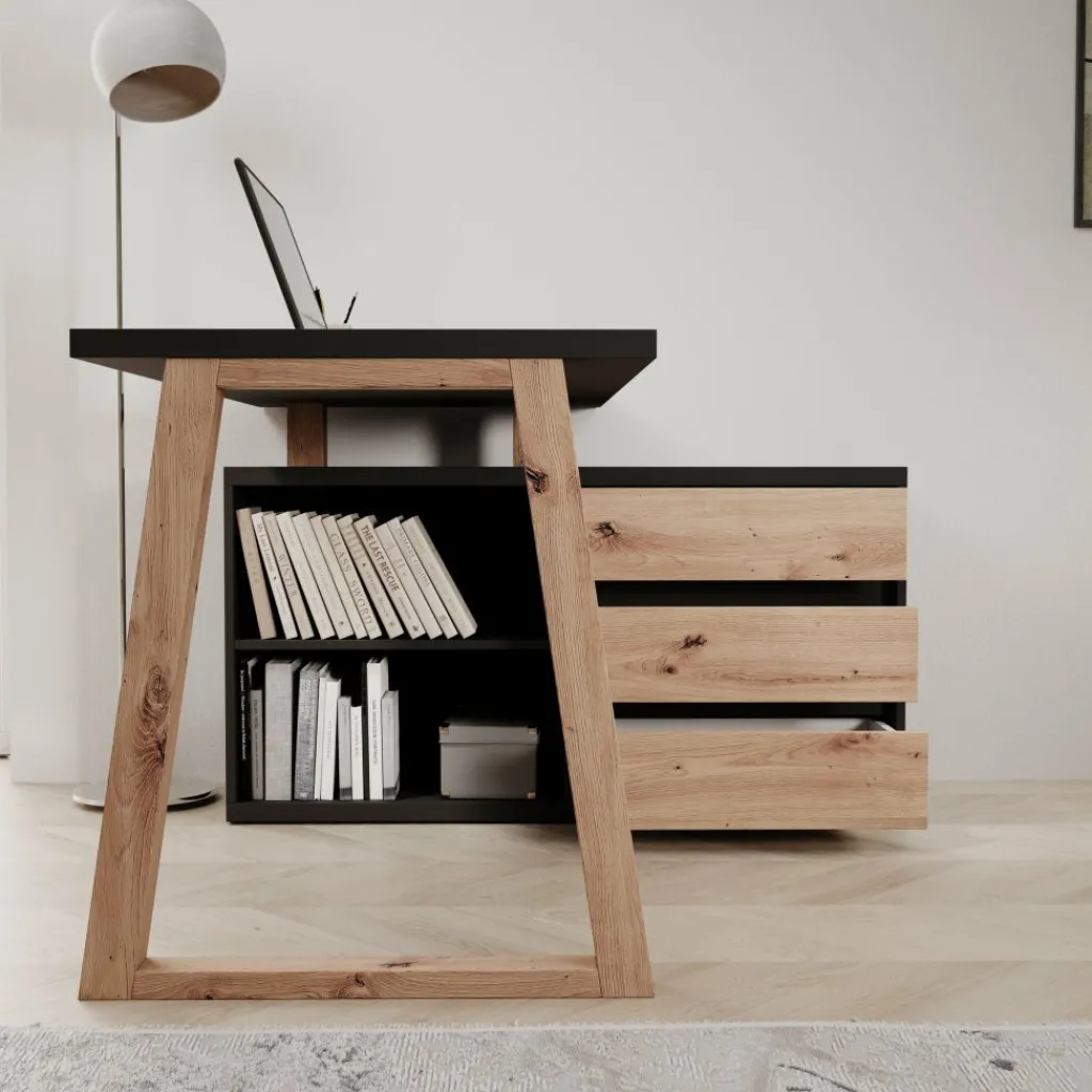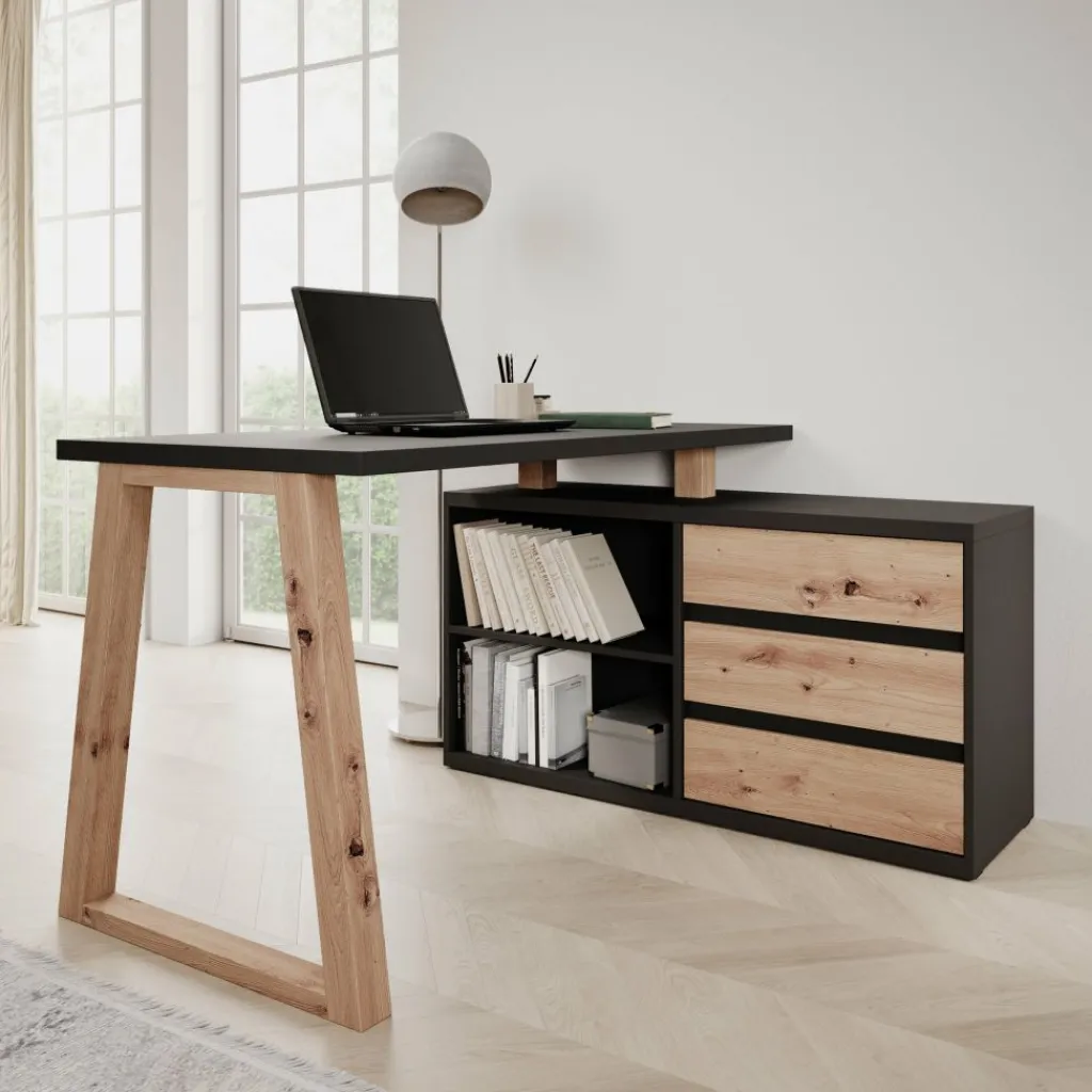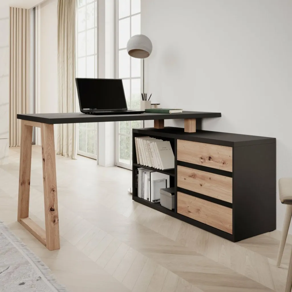Het werkblad biedt voldoende plaats voor een laptop, beeldscherm en accessoires. De combinatie van zwarte panelen en houten details zorgt voor een eigentijdse uitstraling die goed past in verschillende interieurs. Het Ithaca 2 bureau is geschikt voor gebruik in een thuiskantoor, studeerkamer of werkruimte.