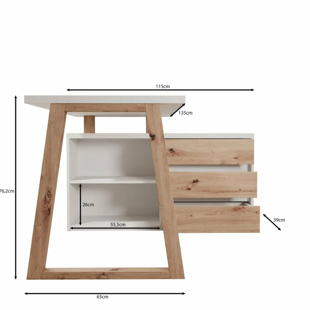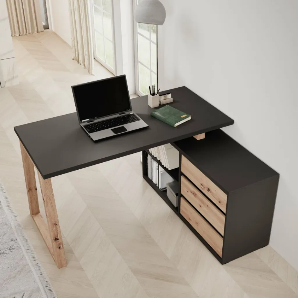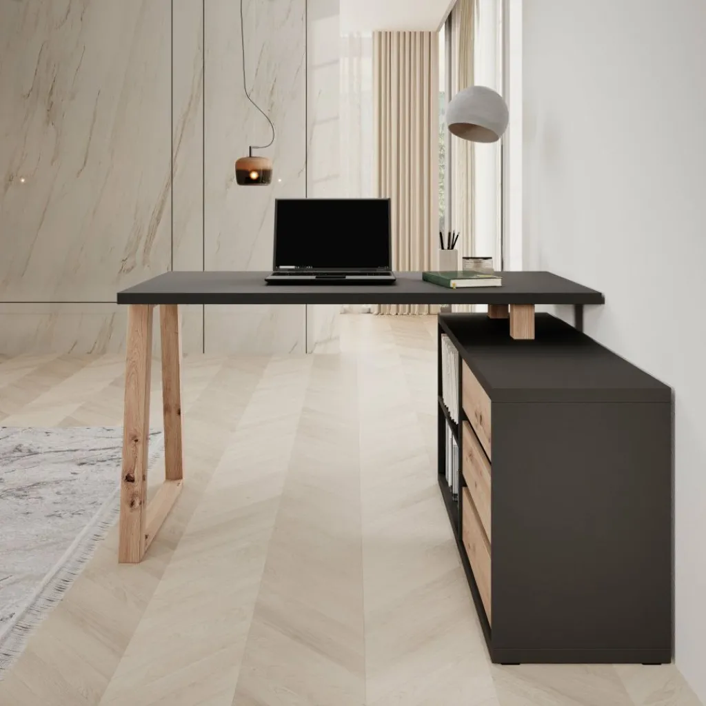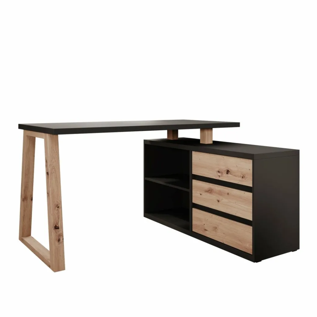 Het werkblad biedt voldoende plaats voor een laptop, beeldscherm en accessoires. De combinatie van zwarte panelen en houten details zorgt voor een eigentijdse uitstraling die goed past in verschillende interieurs. Het Ithaca 2 bureau is geschikt voor gebruik in een thuiskantoor, studeerkamer of werkruimte.