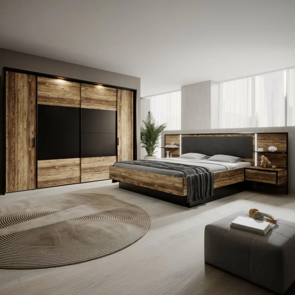 De slaapkamercollectie Jacob brengt warmte en karakter in je interieur. Deze complete set bestaat uit een royaal tweepersoonsbed, twee bijpassende nachtkastjes en een praktische kledingkast – allemaal uitgevoerd in dezelfde robuuste combinatie van zwart en houtdecor.