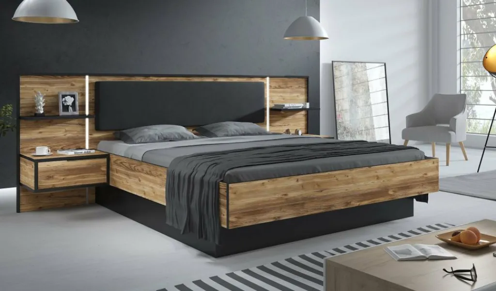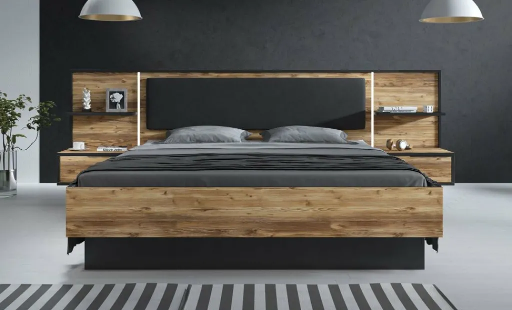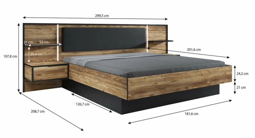 Het bed (299,5 × 208,7 cm) is geschikt voor een matras van 180 × 200 cm en wordt geleverd inclusief twee geïntegreerde nachtkastjes. De brede achterwand is voorzien van LED-verlichting en een zacht gestoffeerd kussen, wat zorgt voor extra comfort én sfeer. De lattenbodem en matras zijn niet inbegrepen.