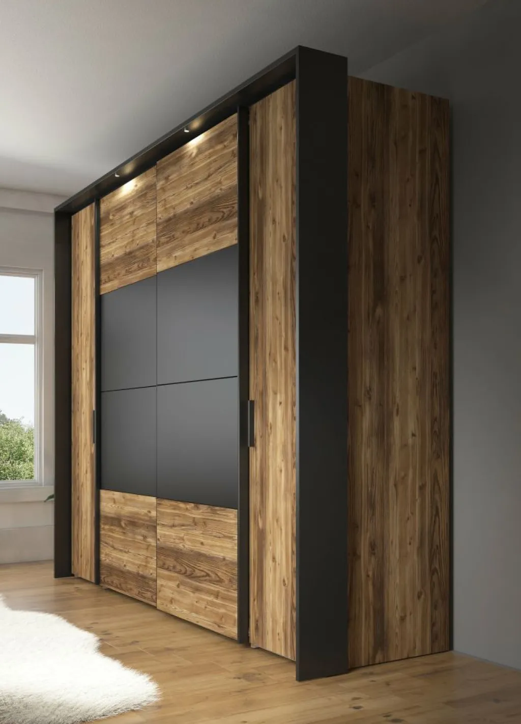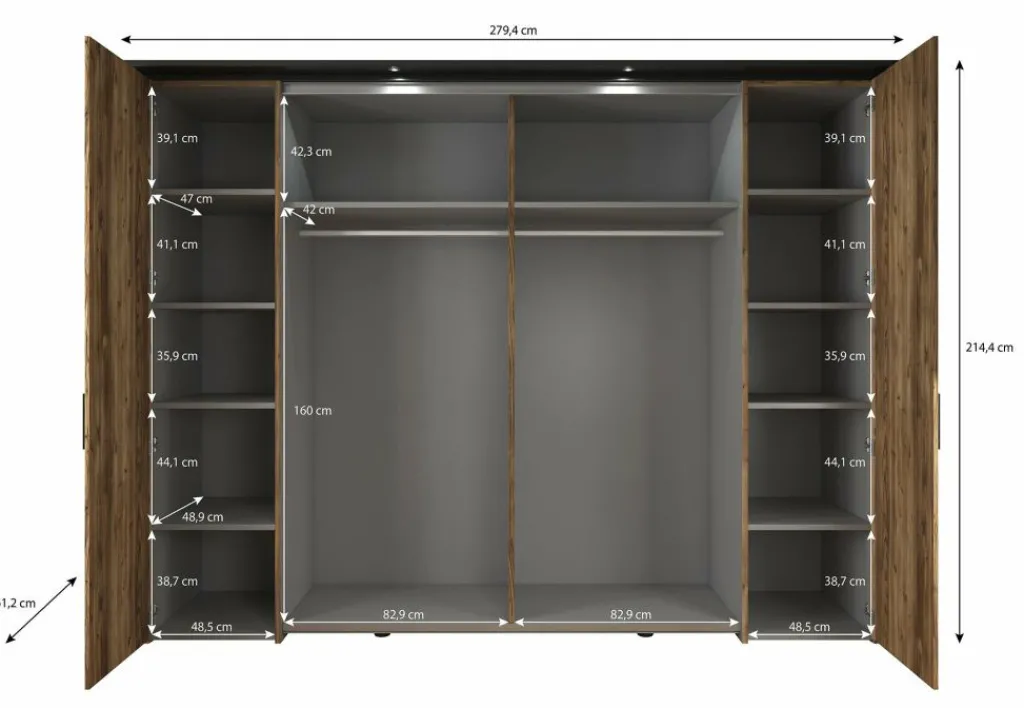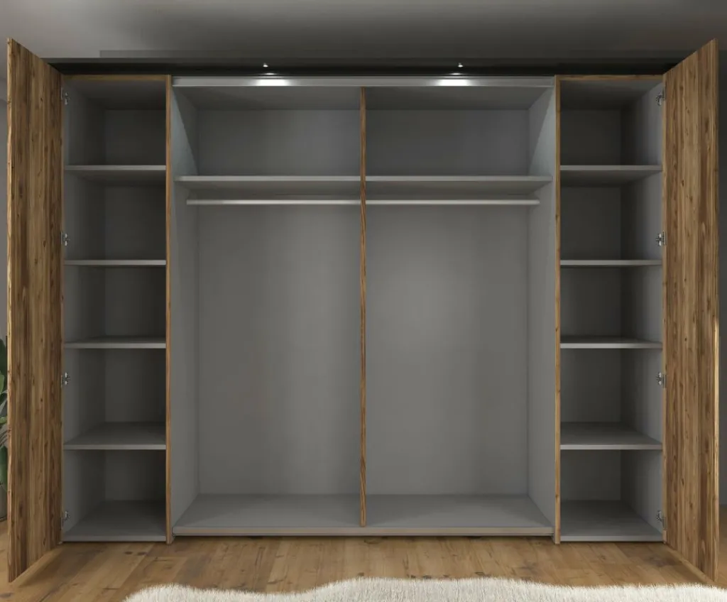 De bijpassende kledingkast (279,4 × 61,2 × 214,4 cm) heeft een praktische indeling met twee schuifdeuren en twee scharnierdeuren. De strakke, zwarte handgrepen geven het geheel een moderne look. Binnenin vind je twaalf opbergvakken en twee kledingroedes: ideaal voor zowel liggende als hangende kleding.