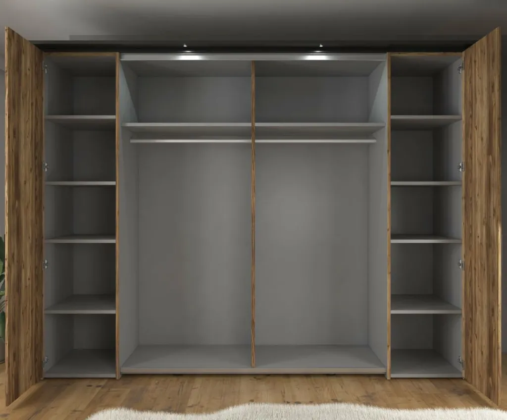 Kledingkast Jacob is een garderobekast met ruime opbergmogelijkheden. Dit model is voorzien van 2 grote schuifdeuren en 2 klapdeuren. Aan de binnenkant van de kast bevinden zich 2 kledingstangen om kleding op te hangen. Daarboven zitten 2 ruime schappen. Aan beide kanten zitten nog eens 5 opbergvakken. Dit model is afgewerkt in eiken kleur met mat zwarte details.