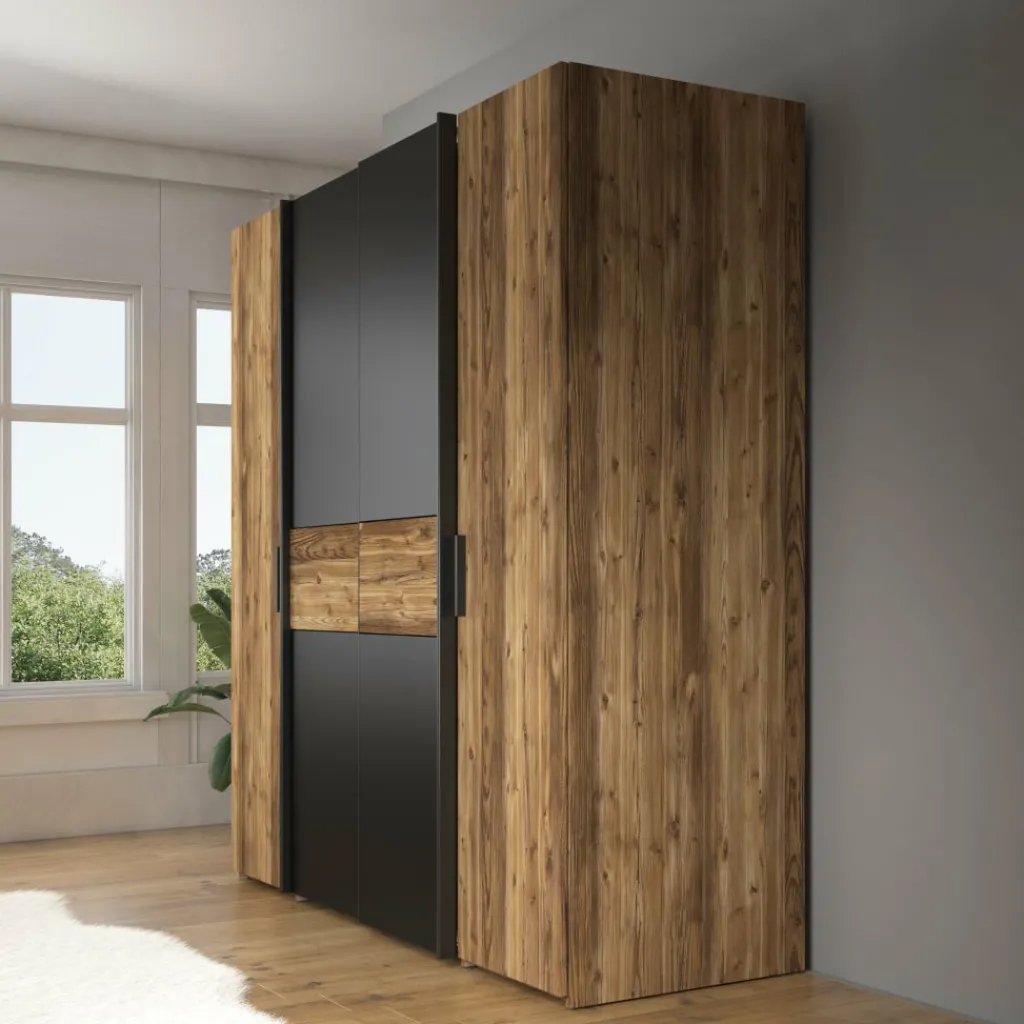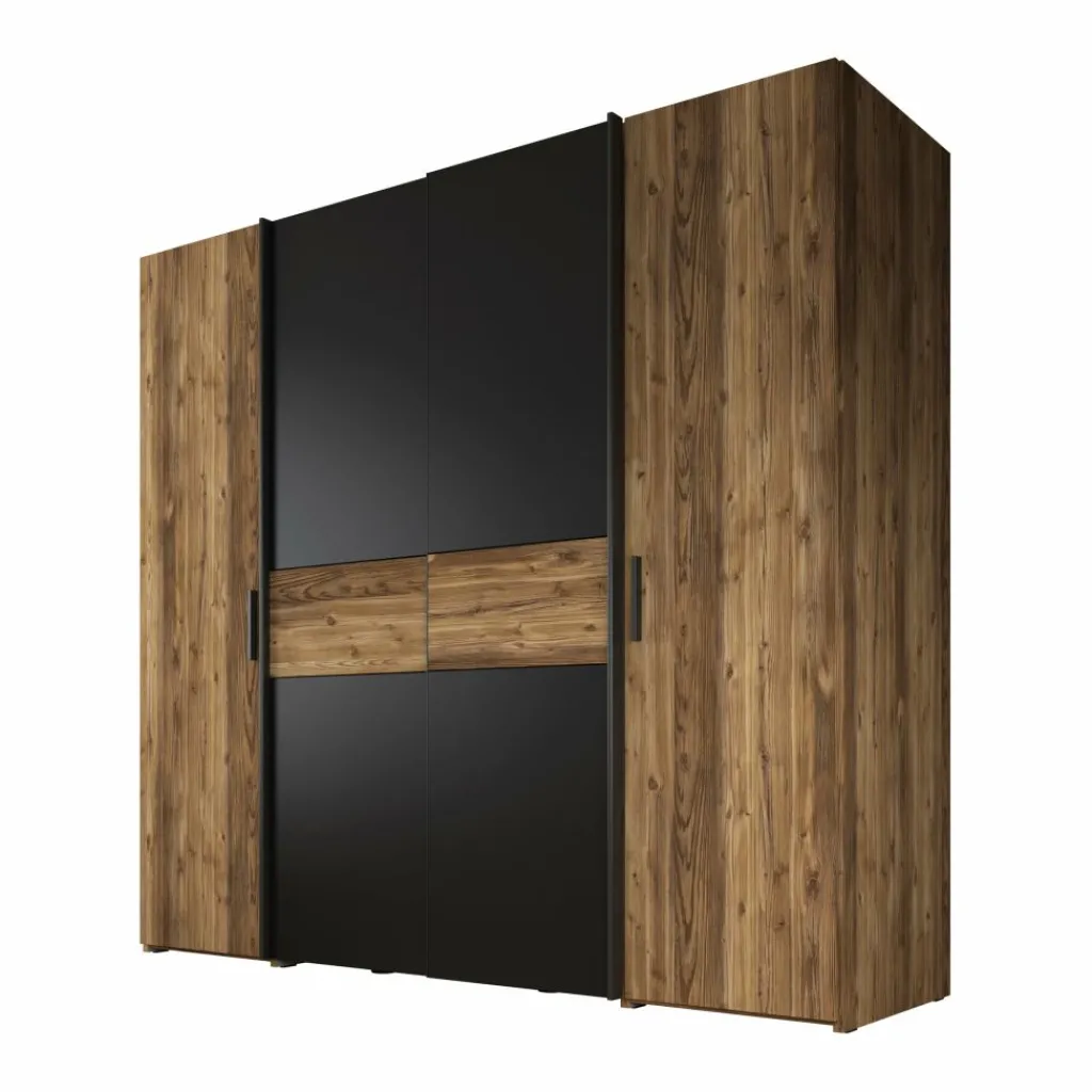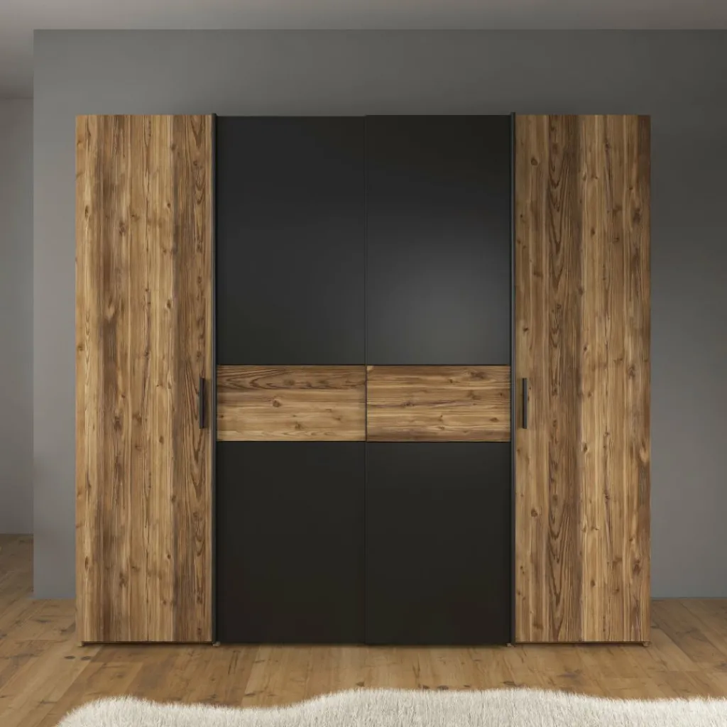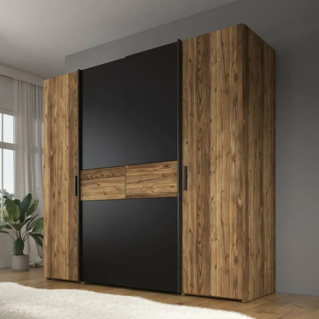 Het ontwerp valt op door de combinatie van zwarte fronten met eiken accenten. De centrale schuifdeuren zorgen ervoor dat de kast weinig ruimte nodig heeft om te openen, terwijl de zijvakken achter draaideuren extra opbergruimte bieden. Hierdoor is de kast geschikt voor zowel grotere slaapkamers als kamers waar efficiënt ruimtegebruik belangrijk is.