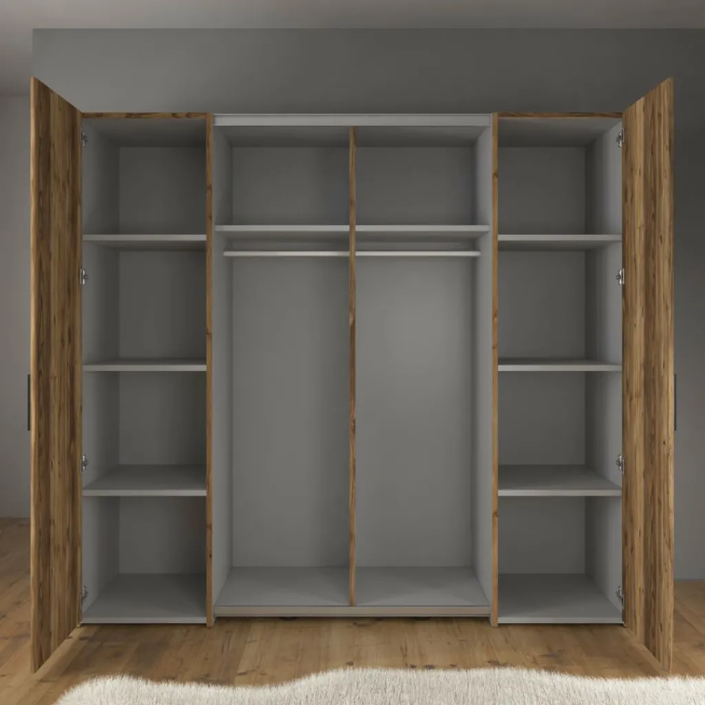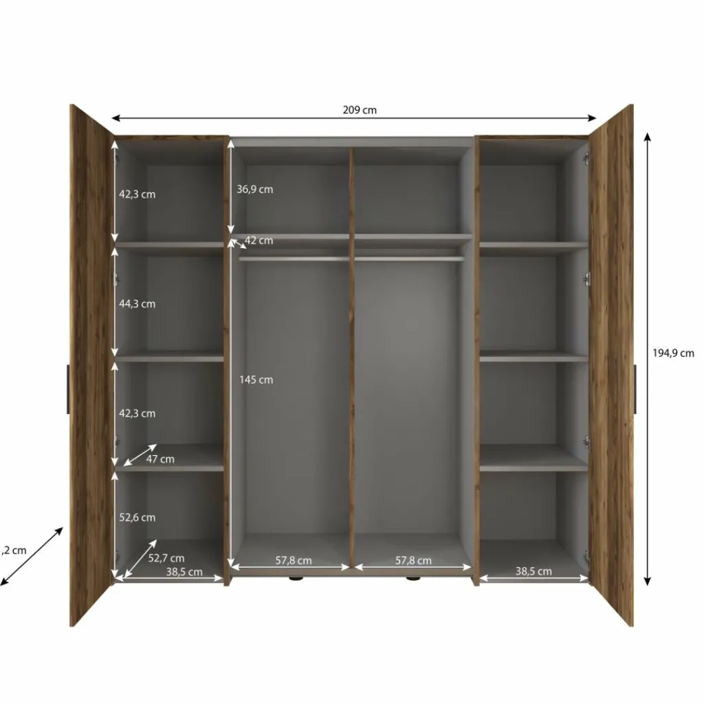 Deze kledingkast biedt een overzichtelijke indeling voor het opbergen van kleding, schoenen en accessoires. Met een breedte van 209 cm en een hoogte van 195 cm beschik je over een ruime hangsectie voor langere kledingstukken en meerdere legplanken voor gevouwen kleding. De kast heeft daarnaast aparte vakken aan beide zijden waardoor je jouw garderobe logisch kunt scheiden.