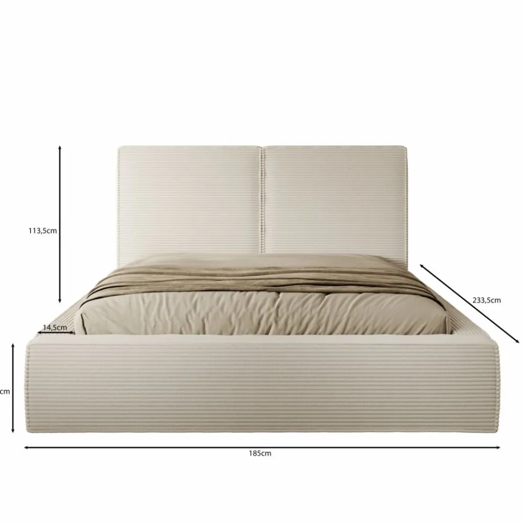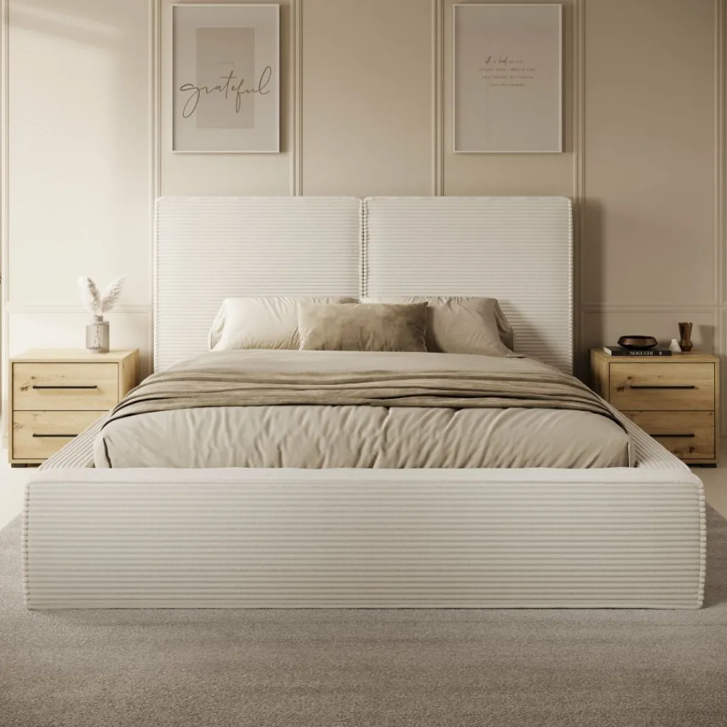 Het Jarviz bed in beige ribstof biedt een combinatie van stijl, comfort en functionaliteit. De zachte ribstofbekleding zorgt voor een warme, uitnodigende uitstraling, terwijl het strakke ontwerp rust en een gevoel van ruimte brengt in de slaapkamer.