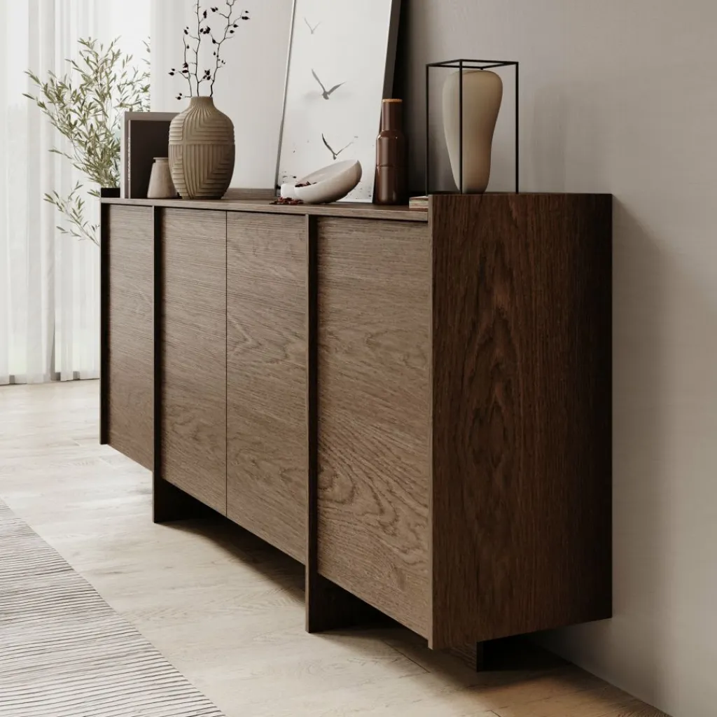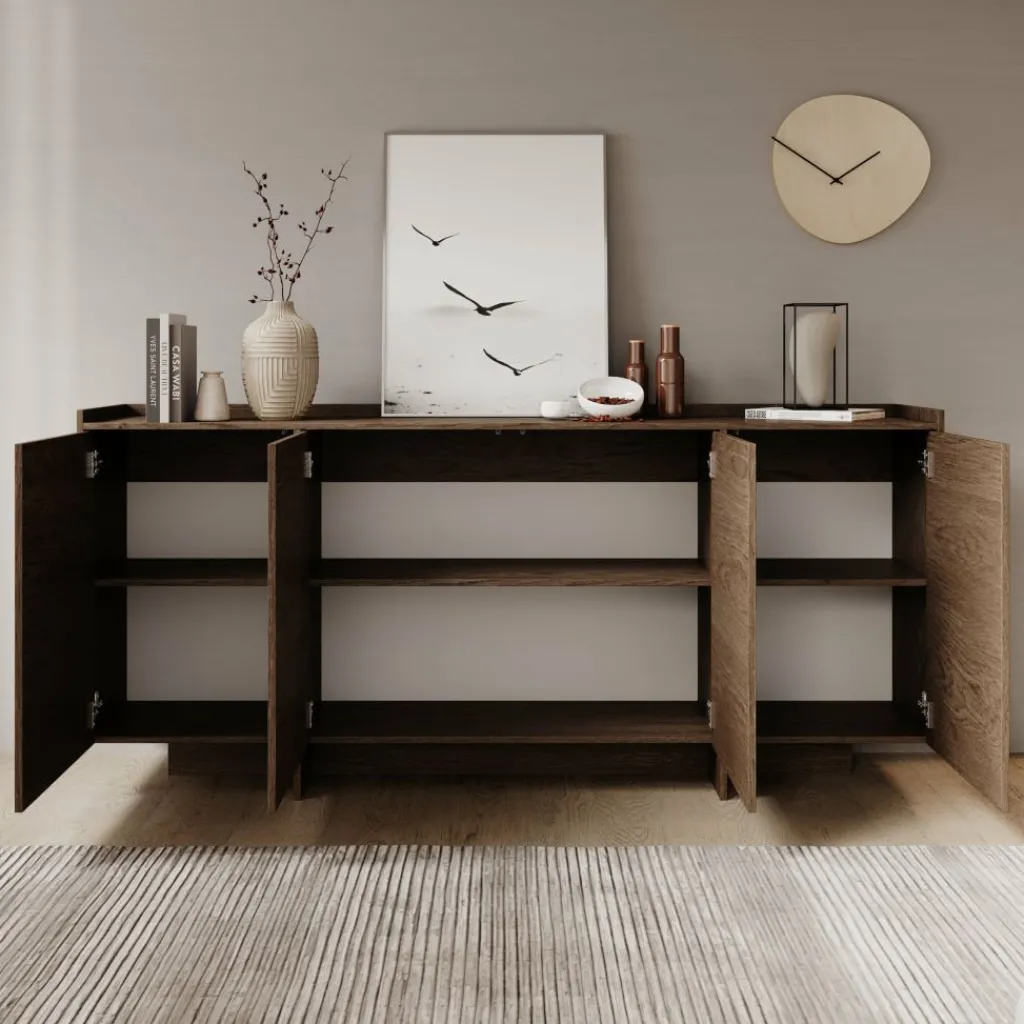 Dressoir Jaxon is een opbergkast in een Japandi stijl. De kast beschikt over 4 deuren die openen met het push to open systeem. Achter de deuren zitten in totaal 6 opbergvakken. De Jaxon is volledig uitgevoerd in de kleur donker eiken.