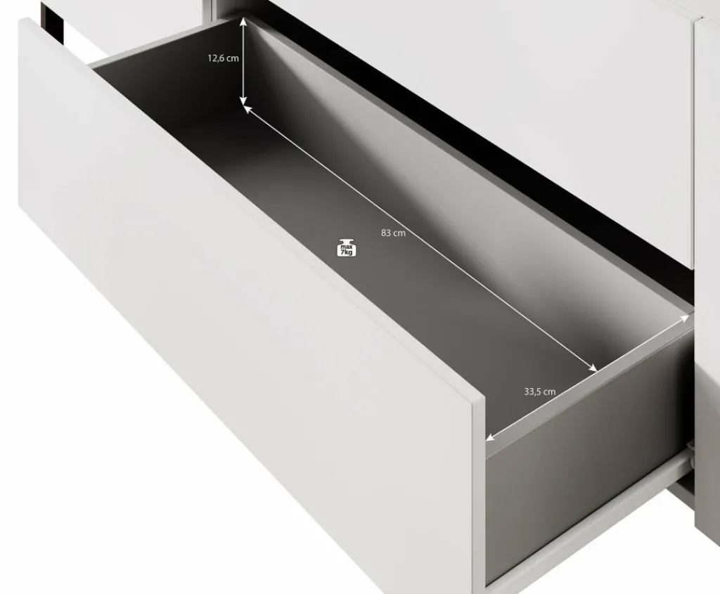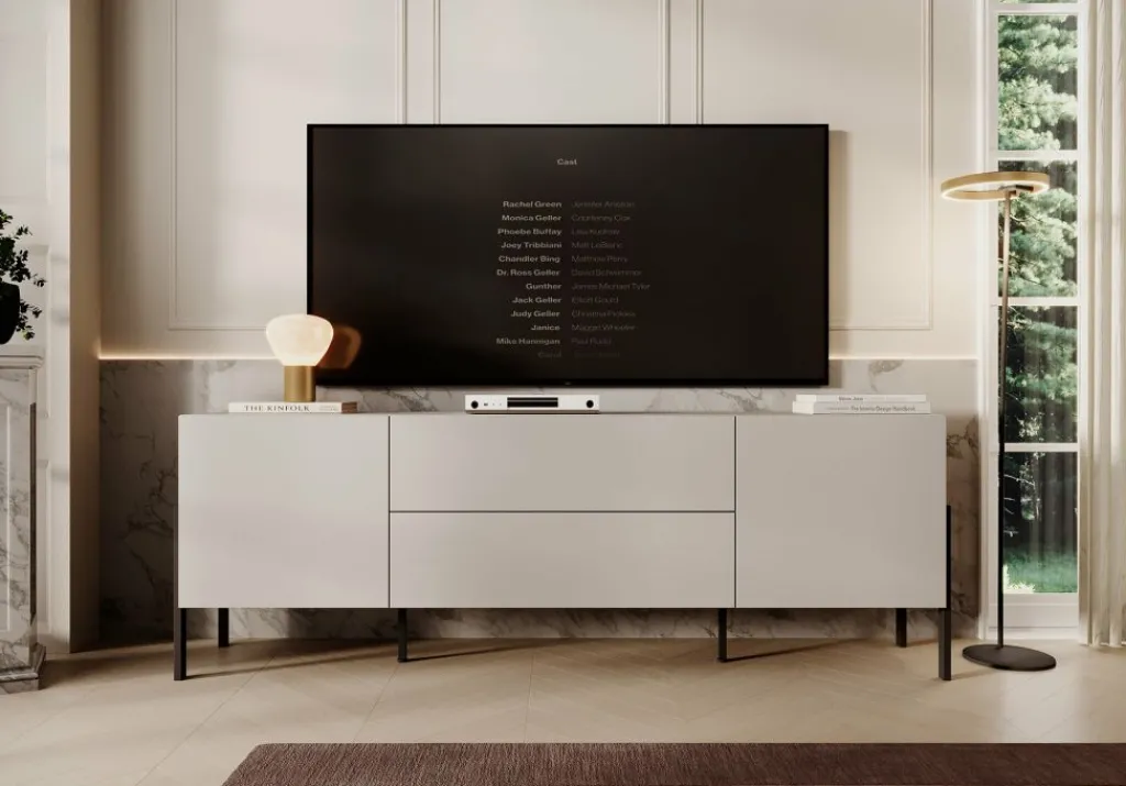 De Jordy beschikt over 2 deuren en 2 lades die openen met het push to open systeem. Achter de deurtjes zijn nog 4 opbergvakken te vinden. De tv kast staat op zwart metalen poten.