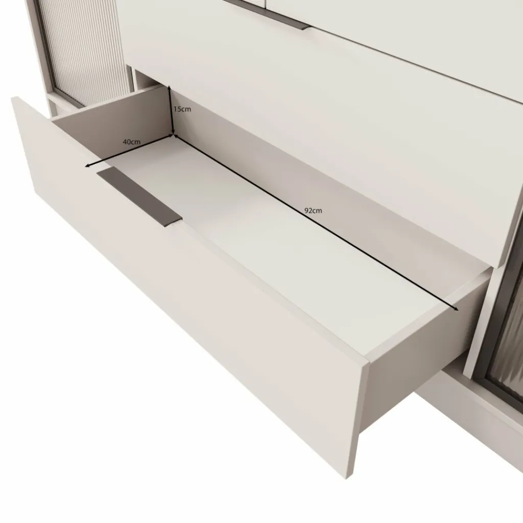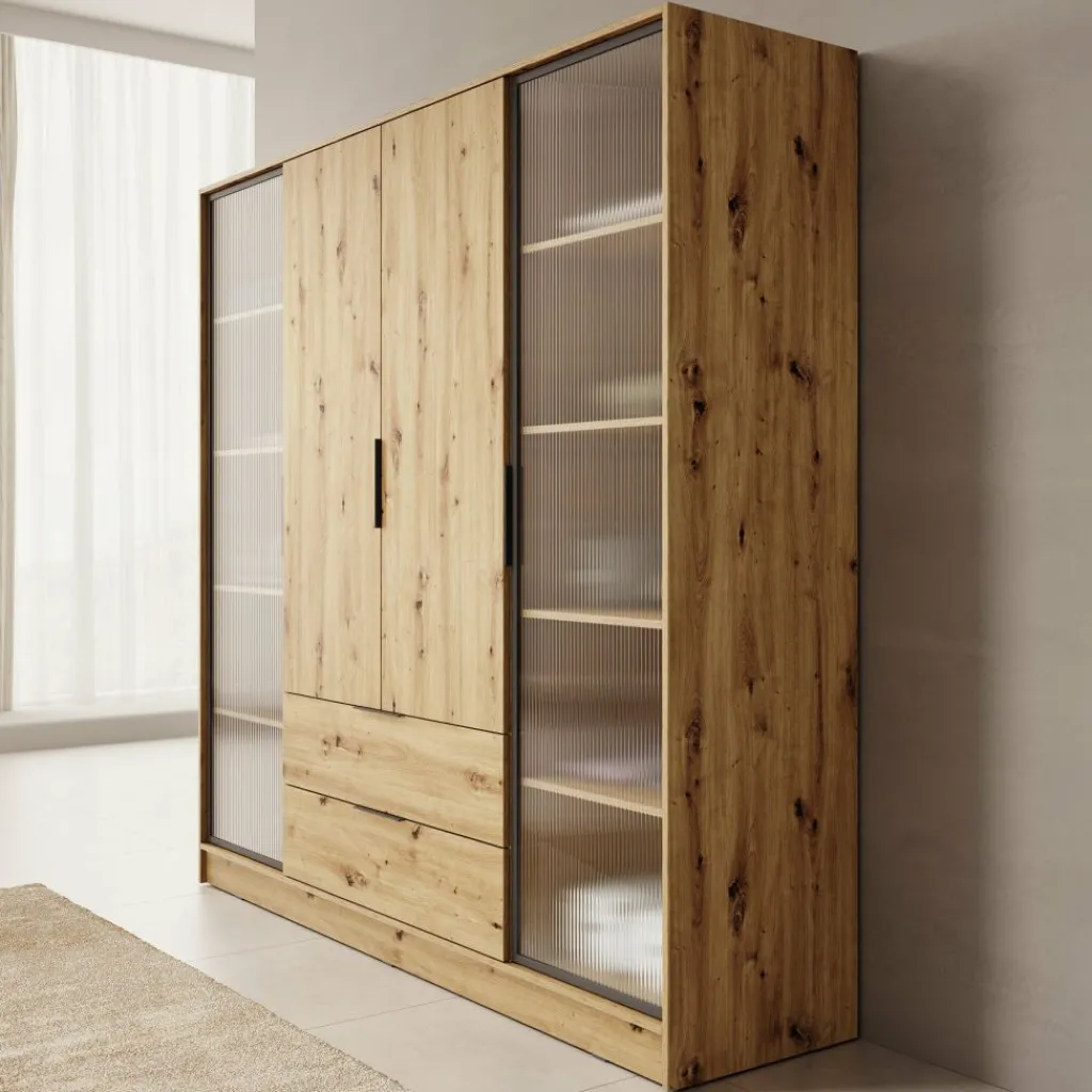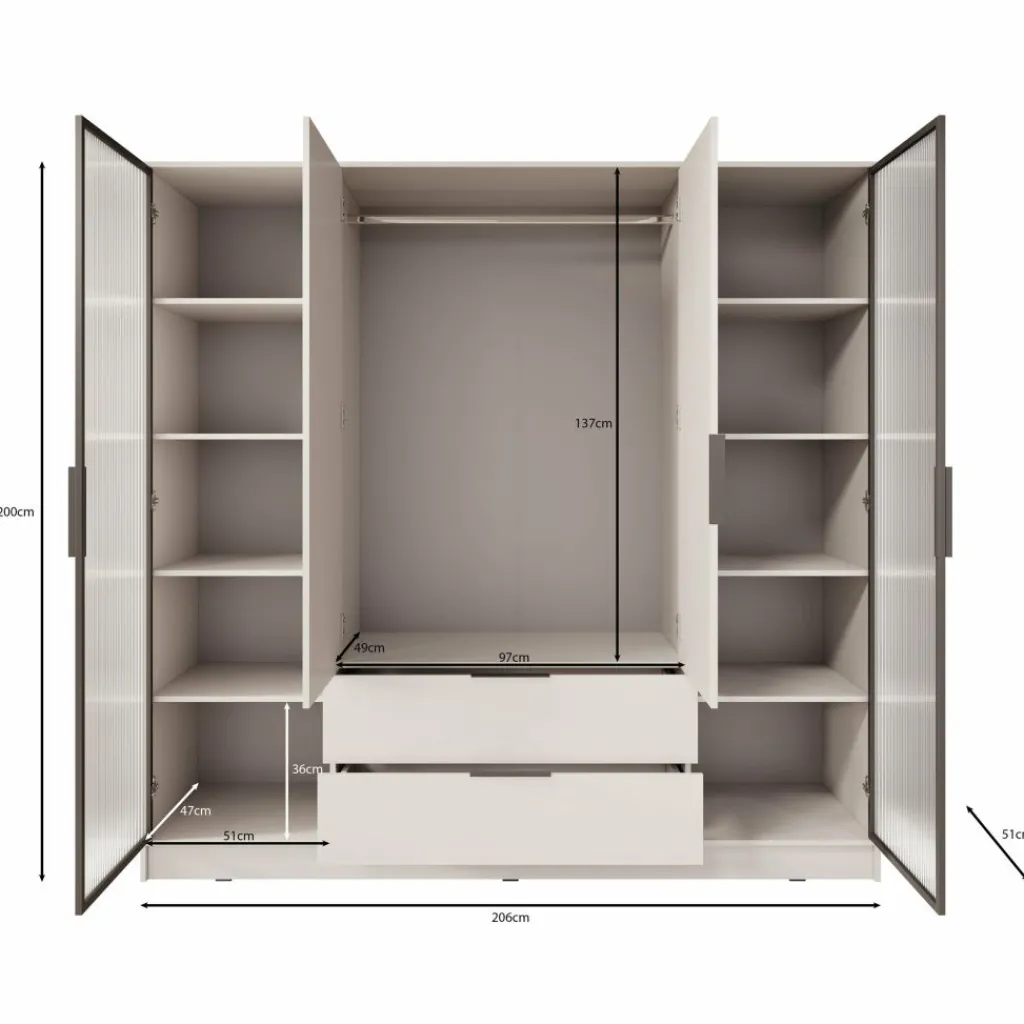 De kast heeft 4 scharnierdeuren, waarvan de buitenste zijn uitgevoerd met elegant gegroefd glas – een stijlvolle touch die zorgt voor een luchtige uitstraling. Achter de deuren vind je een slimme indeling: een royale kledingroede van 97 cm breed voor al je hangkleding, en maar liefst 10 opbergvakken met verschillende hoogtes. Perfect voor gevouwen kleding, dozen of tassen.