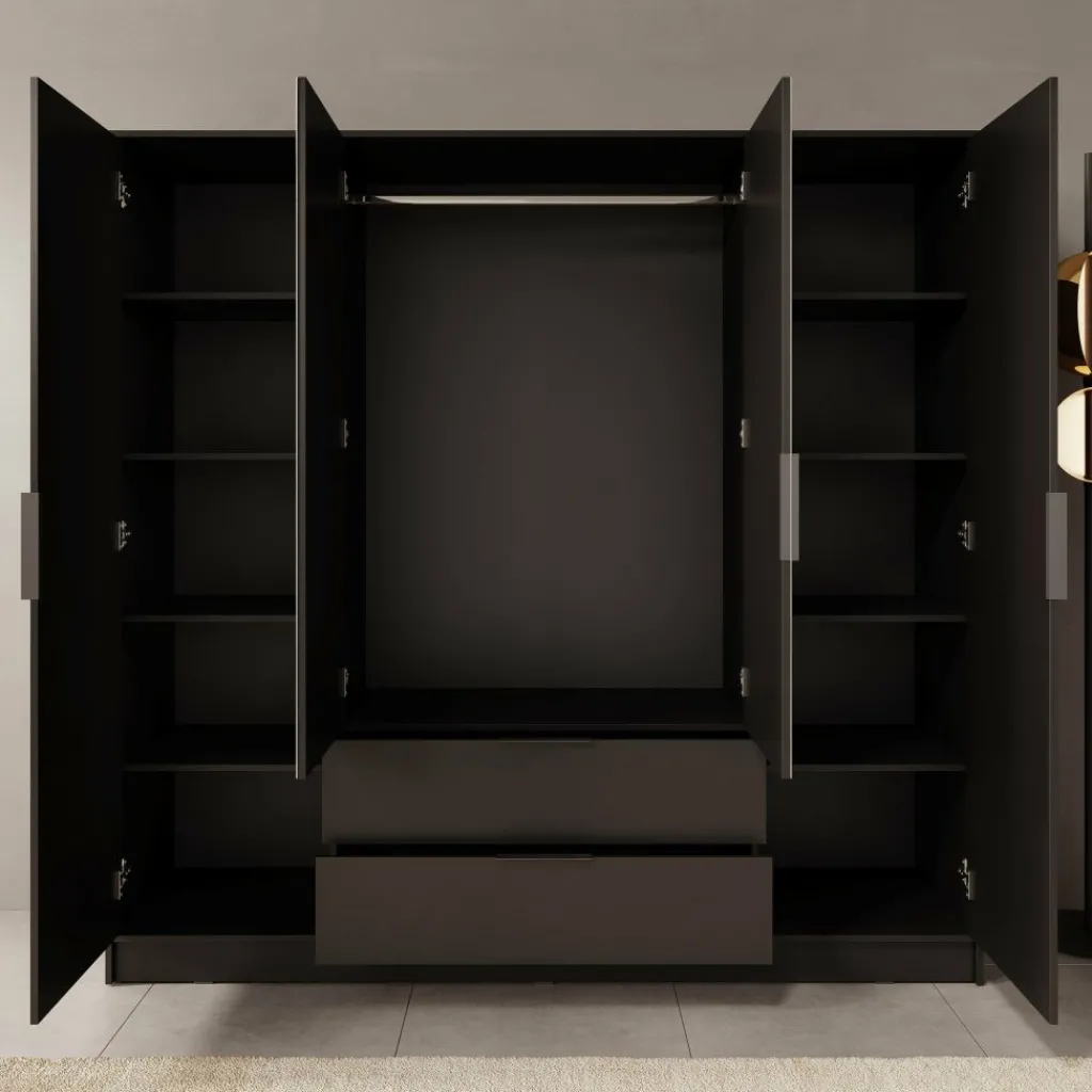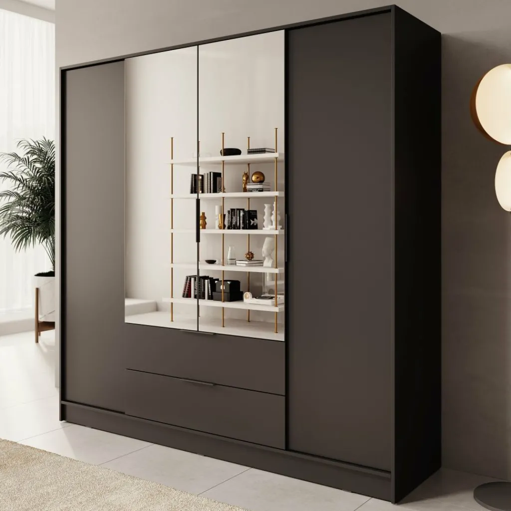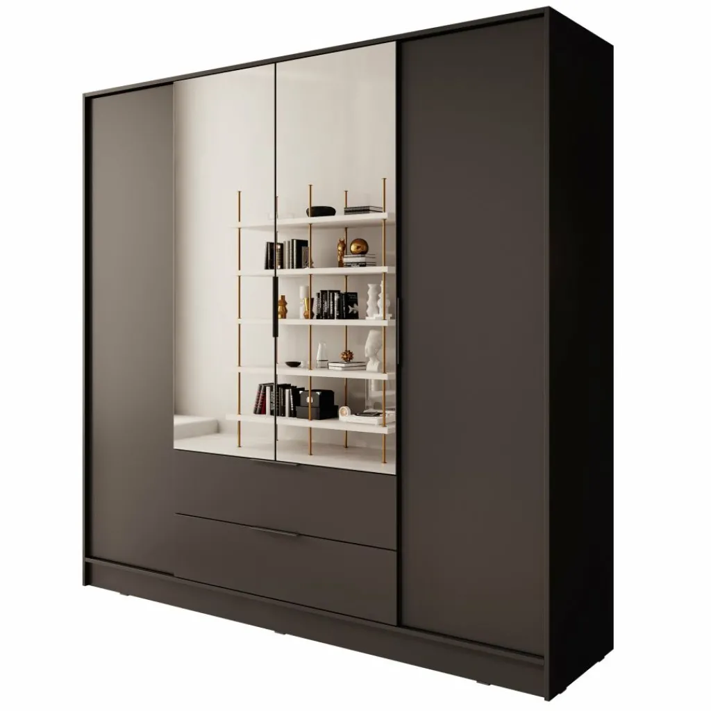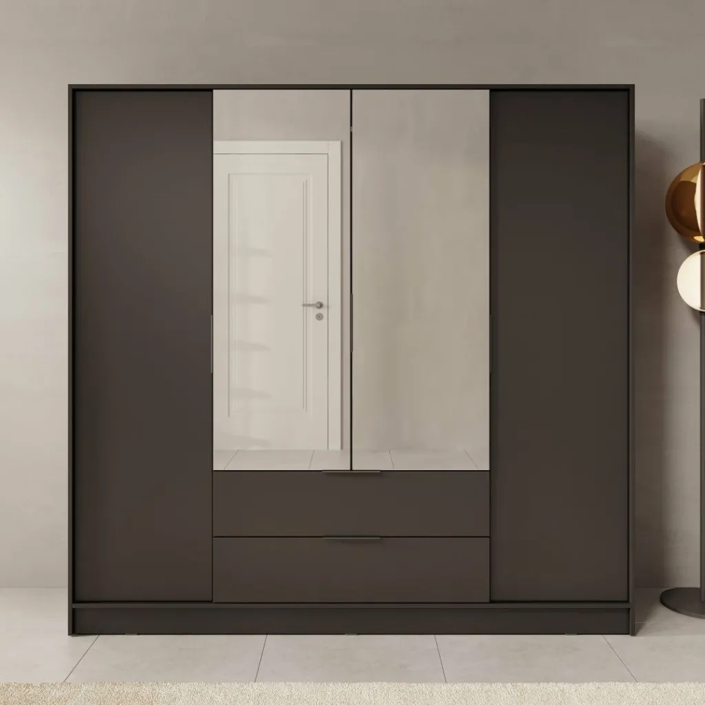 Deze moderne garderobekast is uitgevoerd in een zwarte kleur en past moeiteloos in uiteenlopende interieurstijlen. De twee middelste deuren zijn voorzien van grote spiegels die niet alleen functioneel zijn, maar ook zorgen voor een ruimtelijk effect in de kamer.