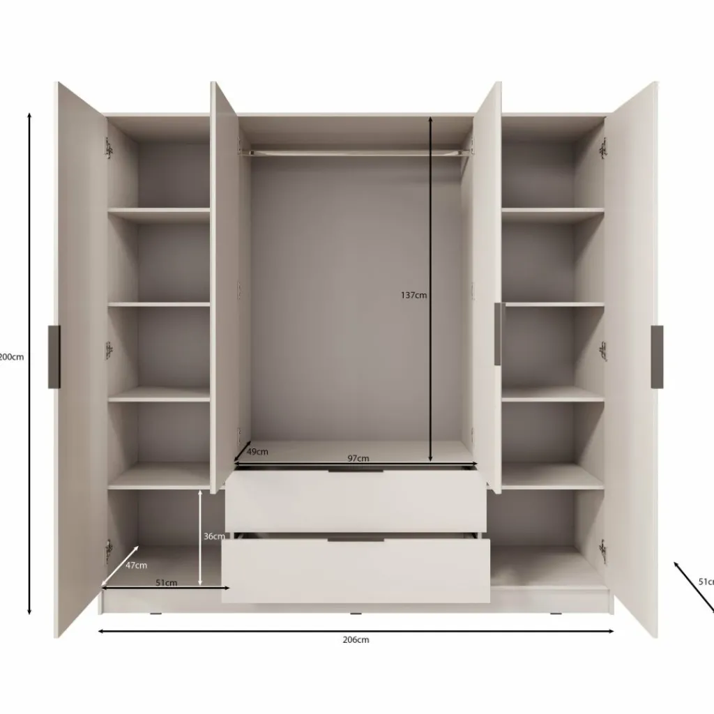 Achter de vier scharnierdeuren bevindt zich een doordachte indeling met voldoende opbergmogelijkheden. In het midden is een kledingroede van 97 cm breed geplaatst, waar je moeiteloos al je hangkleding aan kwijt kunt. Daarnaast zijn er tien legvakken in verschillende formaten, perfect voor gevouwen kleding, accessoires of schoenen. Onderin de kast zitten twee royale lades van 92 bij 40 cm, met een diepte van 15 cm. Ideaal voor het opbergen van ondergoed, sokken of beddengoed.