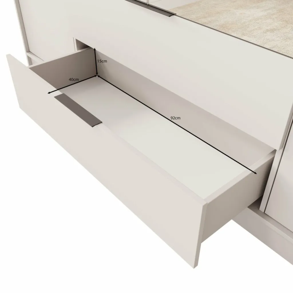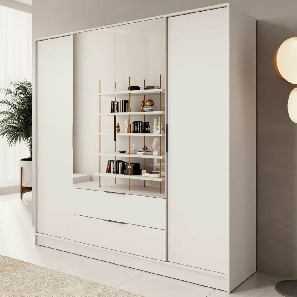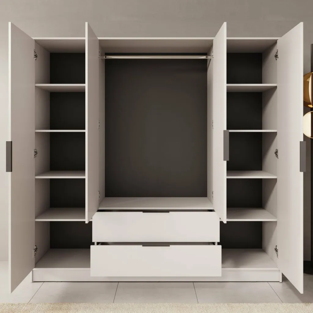 Achter de vier scharnierdeuren bevindt zich een doordachte indeling met voldoende opbergmogelijkheden. In het midden is een kledingroede van 97 cm breed geplaatst, waar je moeiteloos al je hangkleding aan kwijt kunt. Daarnaast zijn er tien legvakken in verschillende formaten, perfect voor gevouwen kleding, accessoires of schoenen. Onderin de kast zitten twee royale lades van 92 bij 40 cm, met een diepte van 15 cm. Ideaal voor het opbergen van ondergoed, sokken of beddengoed.