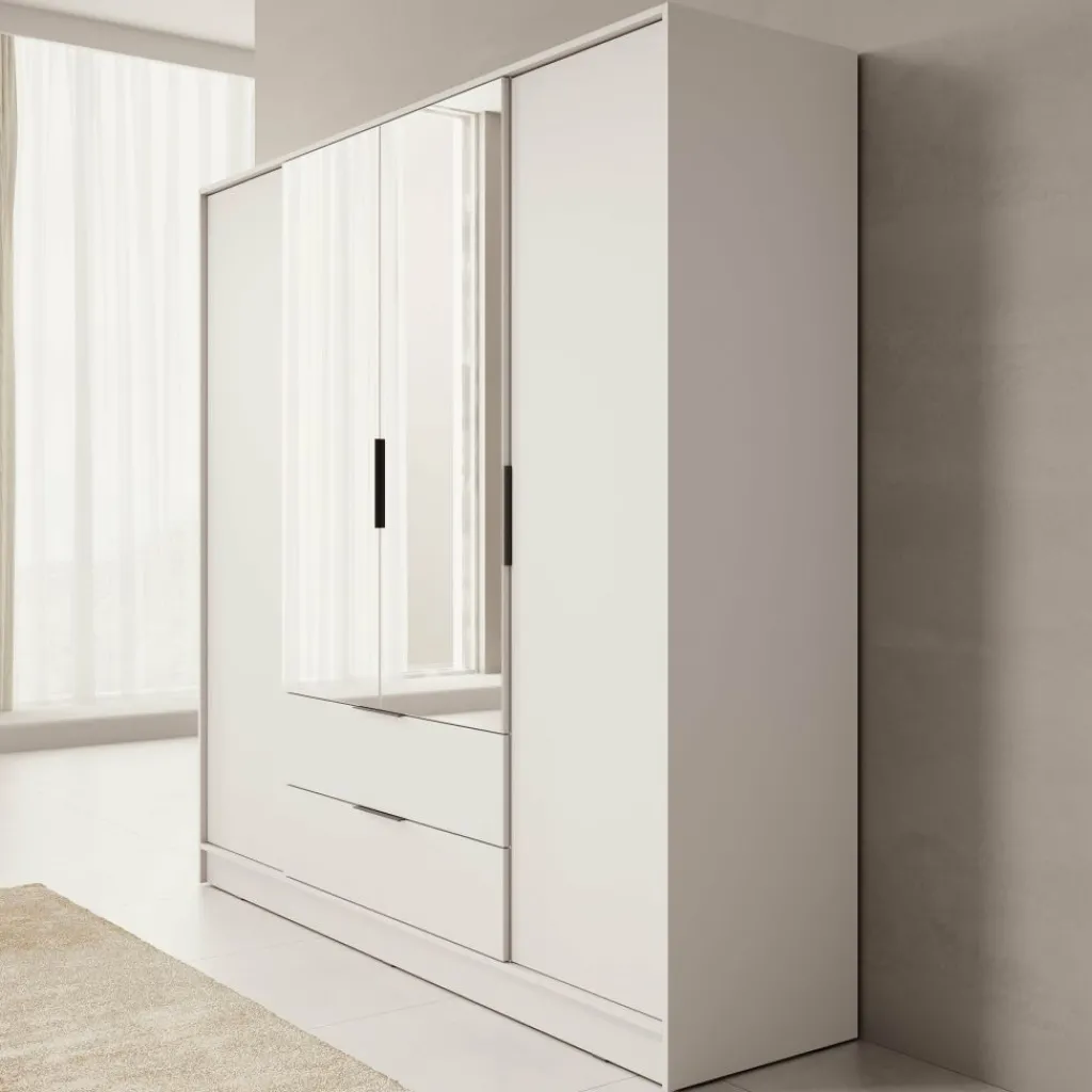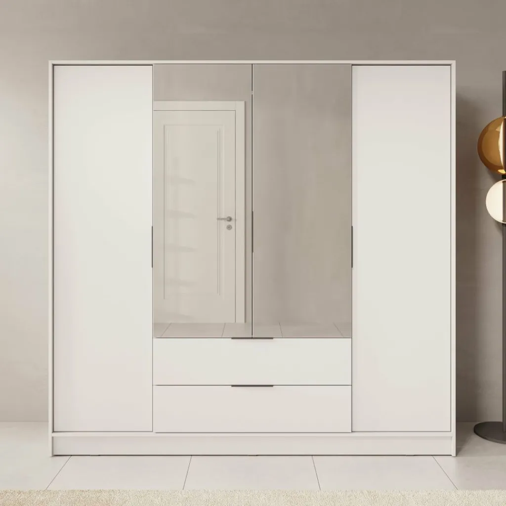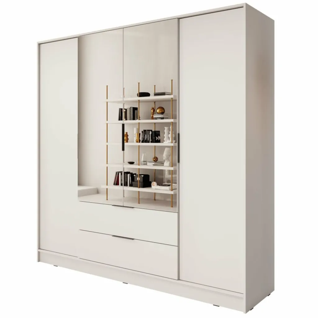Deze moderne garderobekast is uitgevoerd in een rustige beige kleur en past moeiteloos in uiteenlopende interieurstijlen. De twee middelste deuren zijn voorzien van grote spiegels die niet alleen functioneel zijn, maar ook zorgen voor een ruimtelijk effect in de kamer.