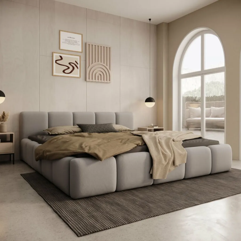 Tweepersoonsbed Karisma is een gestoffeerd bed met opbergruimte, uitgevoerd in grijze stof en geschikt voor een matras van 180×200 cm. Het bed heeft een lage, brede vormgeving met een strak opgebouwd hoofdbord en een volledig rondom beklede bedombouw. De grijze stof geeft het bed een tijdloze, neutrale uitstraling.