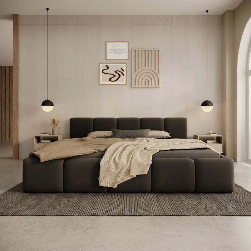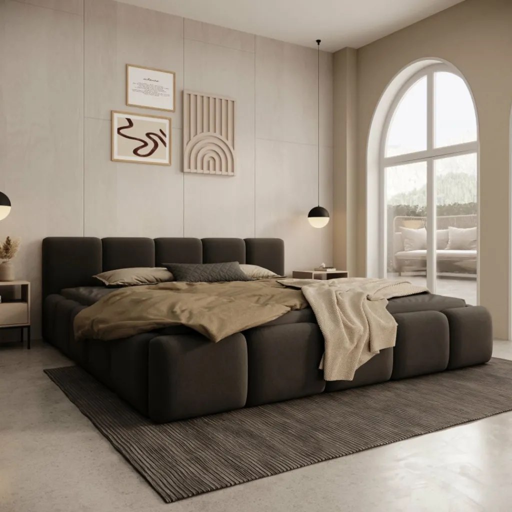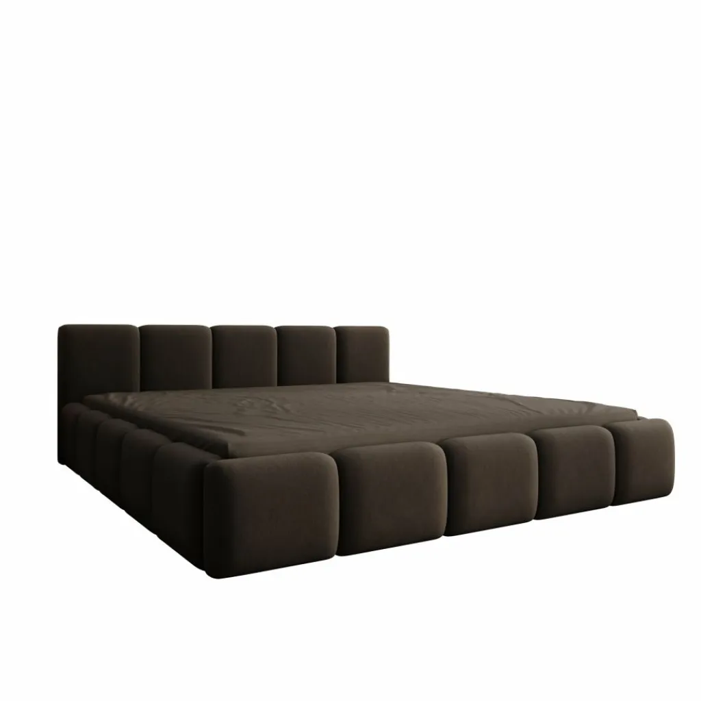 De Karisma staat stabiel op de vloer en is volledig gestoffeerd aan alle zichtbare zijden. Hierdoor vormt het bed één gesloten geheel en kan het ook vrij in de ruimte worden geplaatst. Matrassen worden niet meegeleverd.
