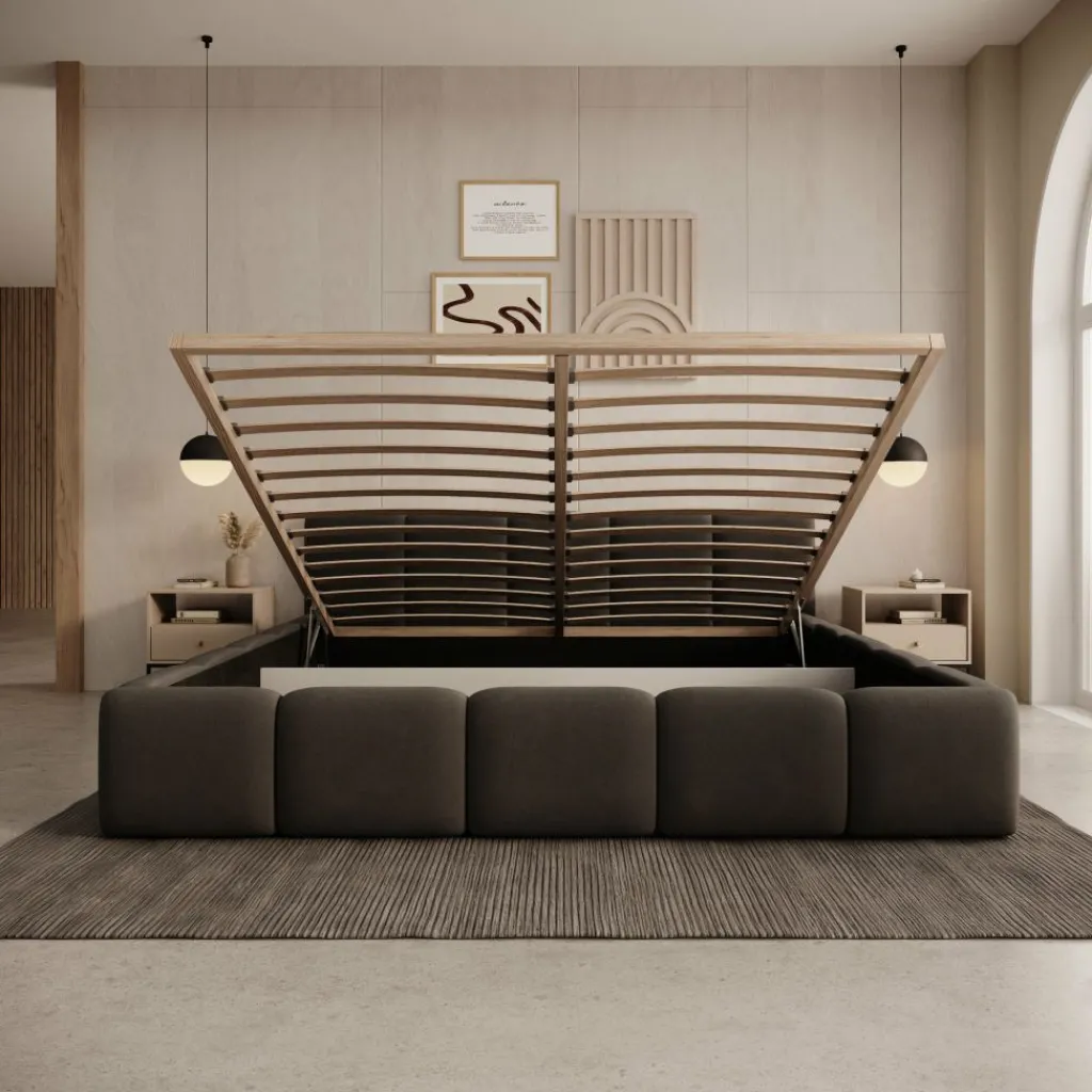 Onder het liggedeelte bevindt zich een ruime opbergbak die toegankelijk is via het omhoog te openen bedframe. Deze opbergruimte is geschikt voor het overzichtelijk opbergen van beddengoed of seizoensartikelen. Dankzij de meebewegende lattenbodem blijft de bak goed toegankelijk.