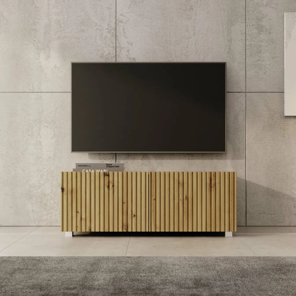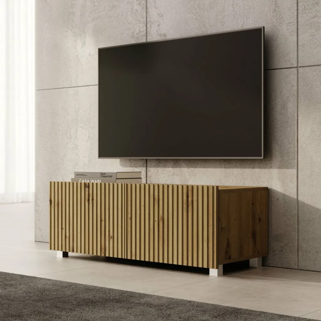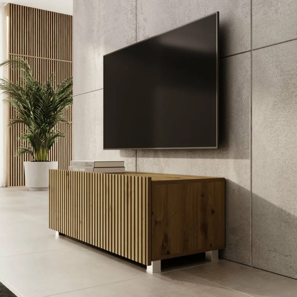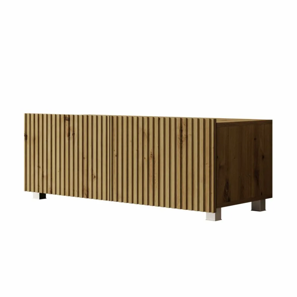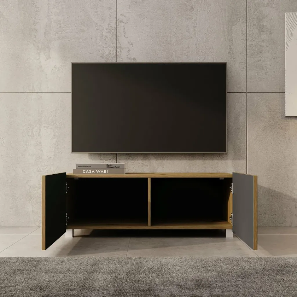 TV-Meubel Kenderes is een opbergkast voor onder de tv in moderne stijl, afgewerkt in een eikenhouten kleur. Het model beschikt over 2 deuren met daarachter 2 opbergvakken. De deuren zijn greeploos en via de boven- of onderkant te openen.