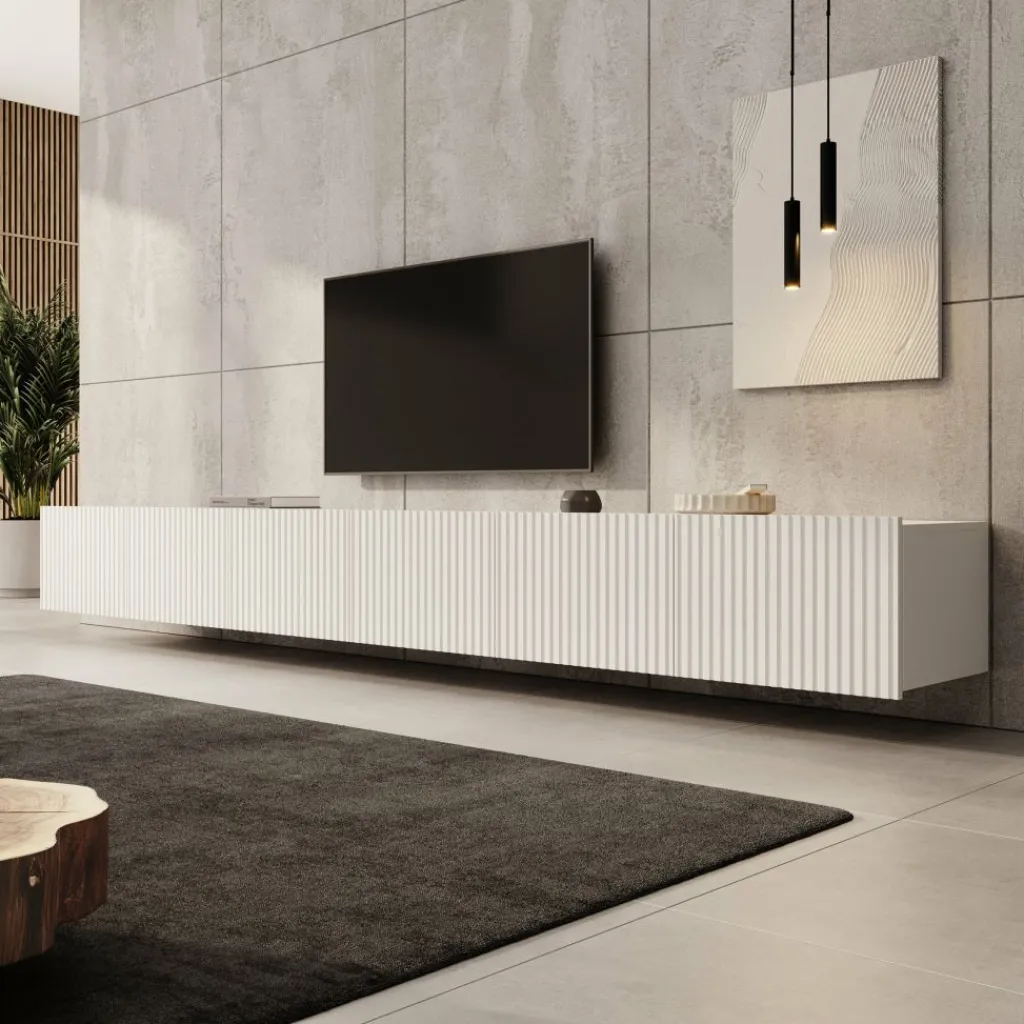 Het tv-meubel Kenderes is aan de muur op te hangen. Toch liever een staand model? Dat kan ook, door eenvoudig de bijgeleverde pootjes te monteren onder het meubel. De pootjes zijn zilverkleurig, gemaakt van kunststof en hebben een hoogte van 5 cm.