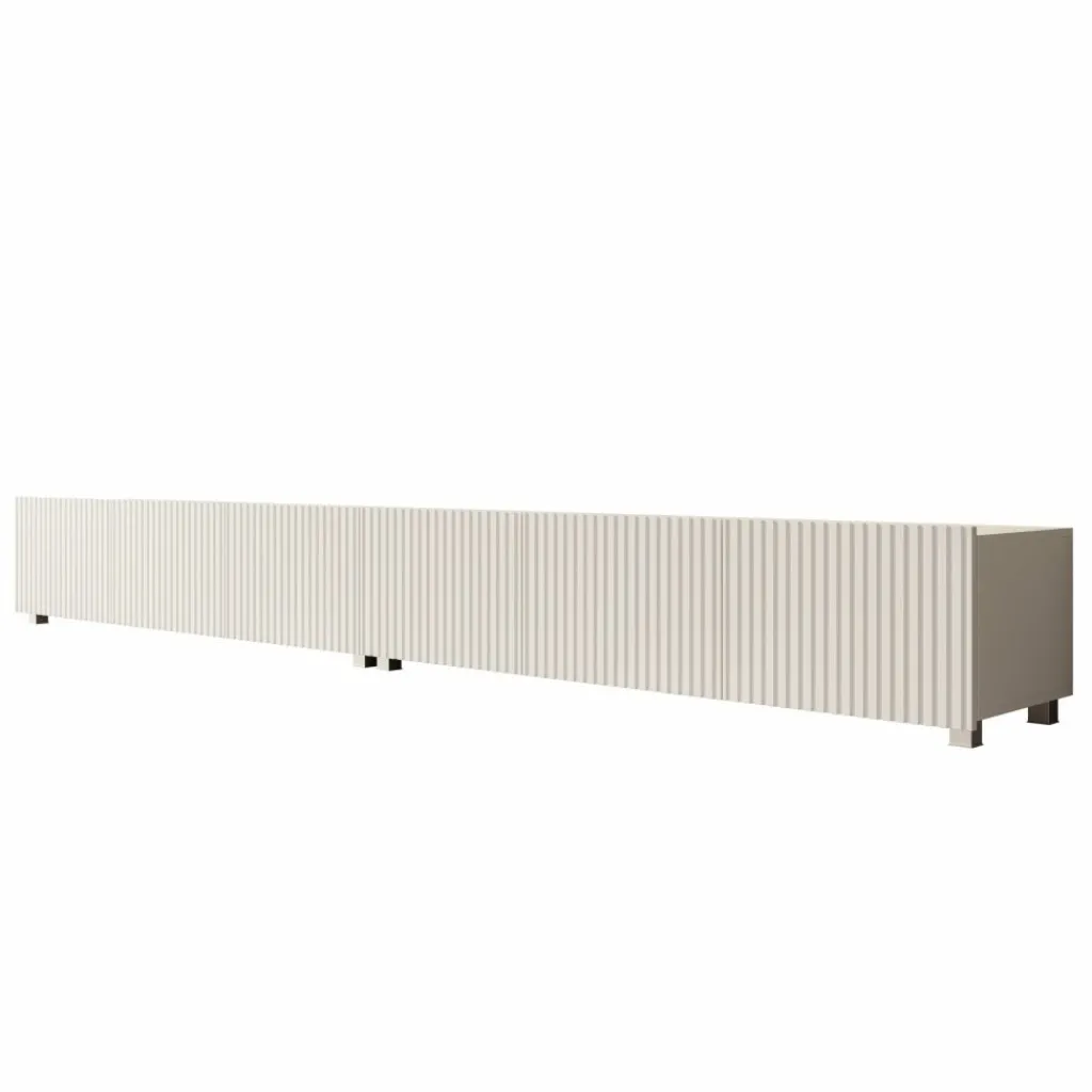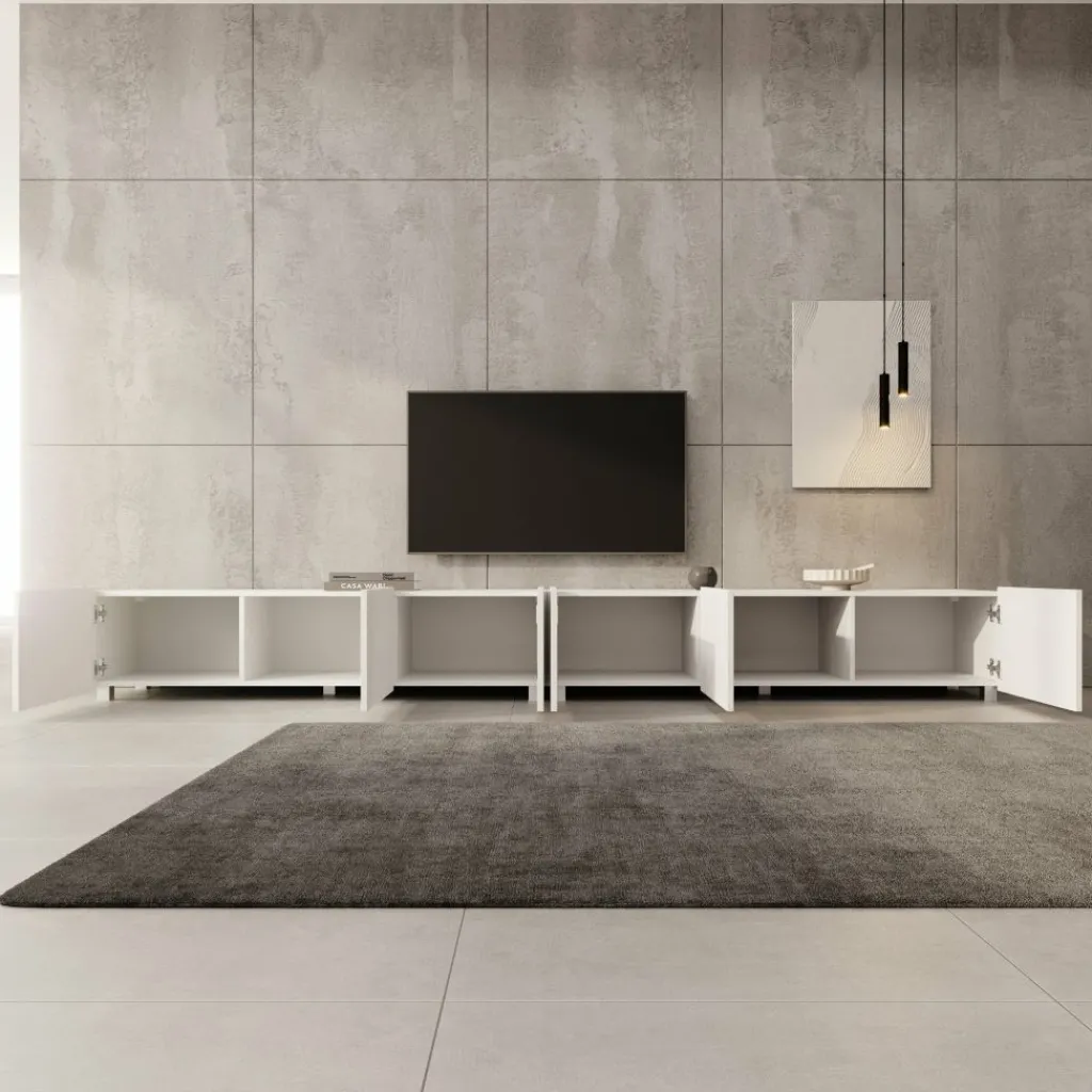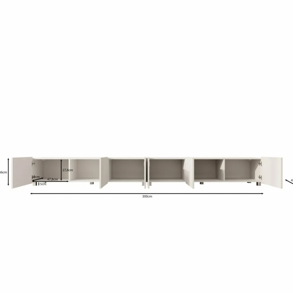 TV-Meubel Kenderes is een opbergkast voor onder de tv in moderne stijl, afgewerkt in een wit kleur. Deze TV kast bestaat uit 2 elementen van 150 cm. Ieder element beschikt over 3 deuren met daarachter 3 opbergvakken. De deuren zijn greeploos en via de boven- of onderkant te openen.