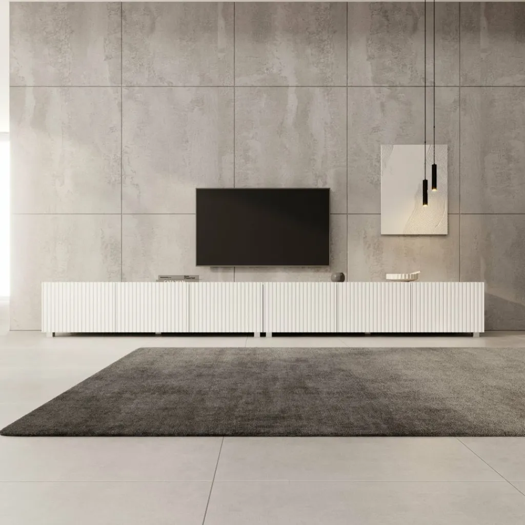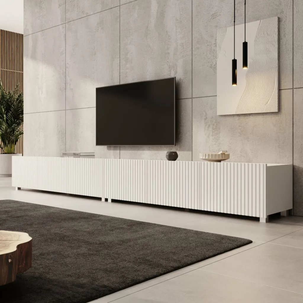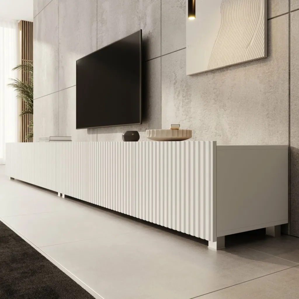 TV-Meubel Kenderes is een opbergkast voor onder de tv in moderne stijl, afgewerkt in een wit kleur. Deze TV kast bestaat uit 2 elementen van 150 cm. Ieder element beschikt over 3 deuren met daarachter 3 opbergvakken. De deuren zijn greeploos en via de boven- of onderkant te openen.