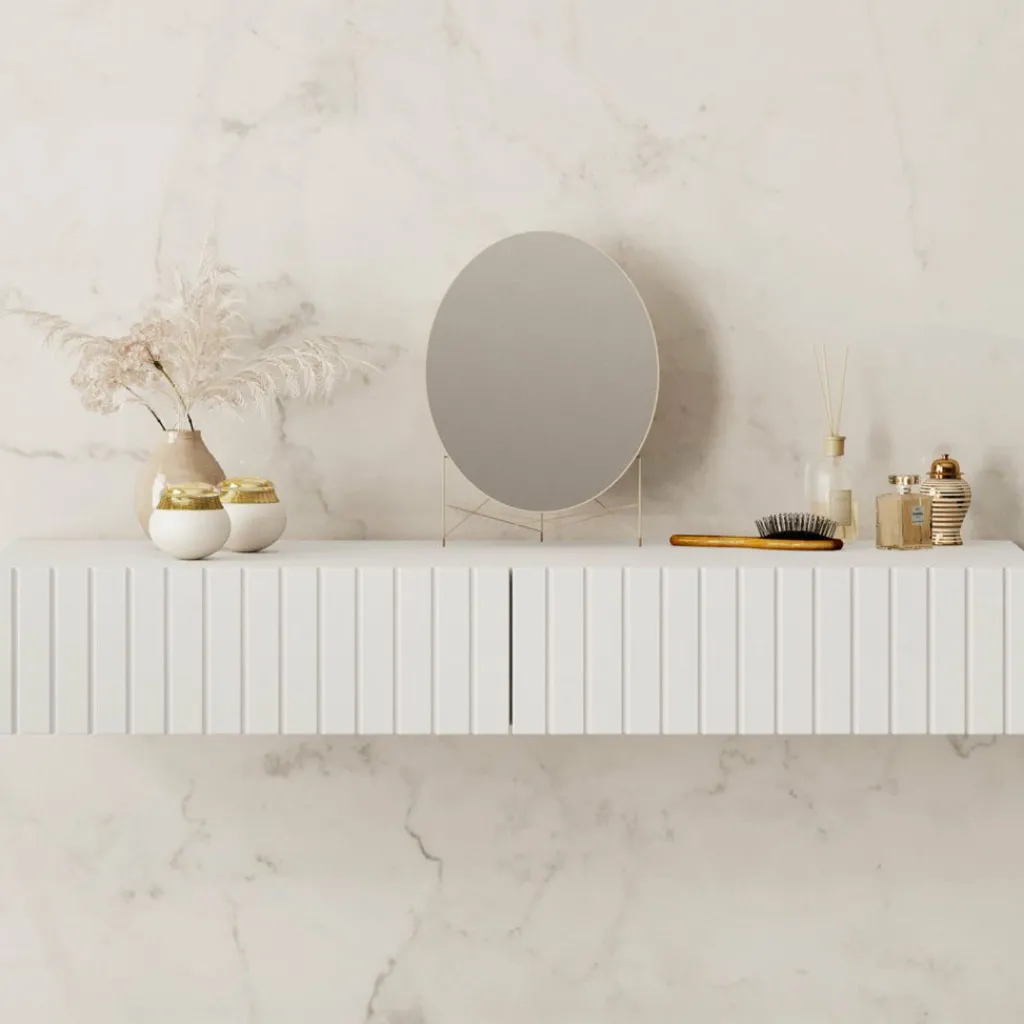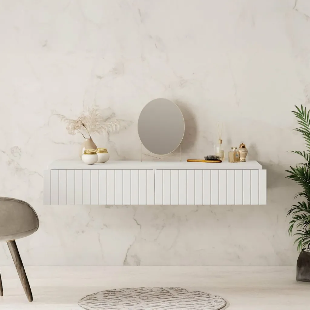 De kaptafel beschikt over 2 greeploze opberglades. Het blad is 100×41 cm en biedt daardoor genoeg plek voor alle make-up, sieraden en accessoires. Dit model is aan de muur op te hangen en bespaard hierdoor een hoop ruimte in jouw slaapkamer.