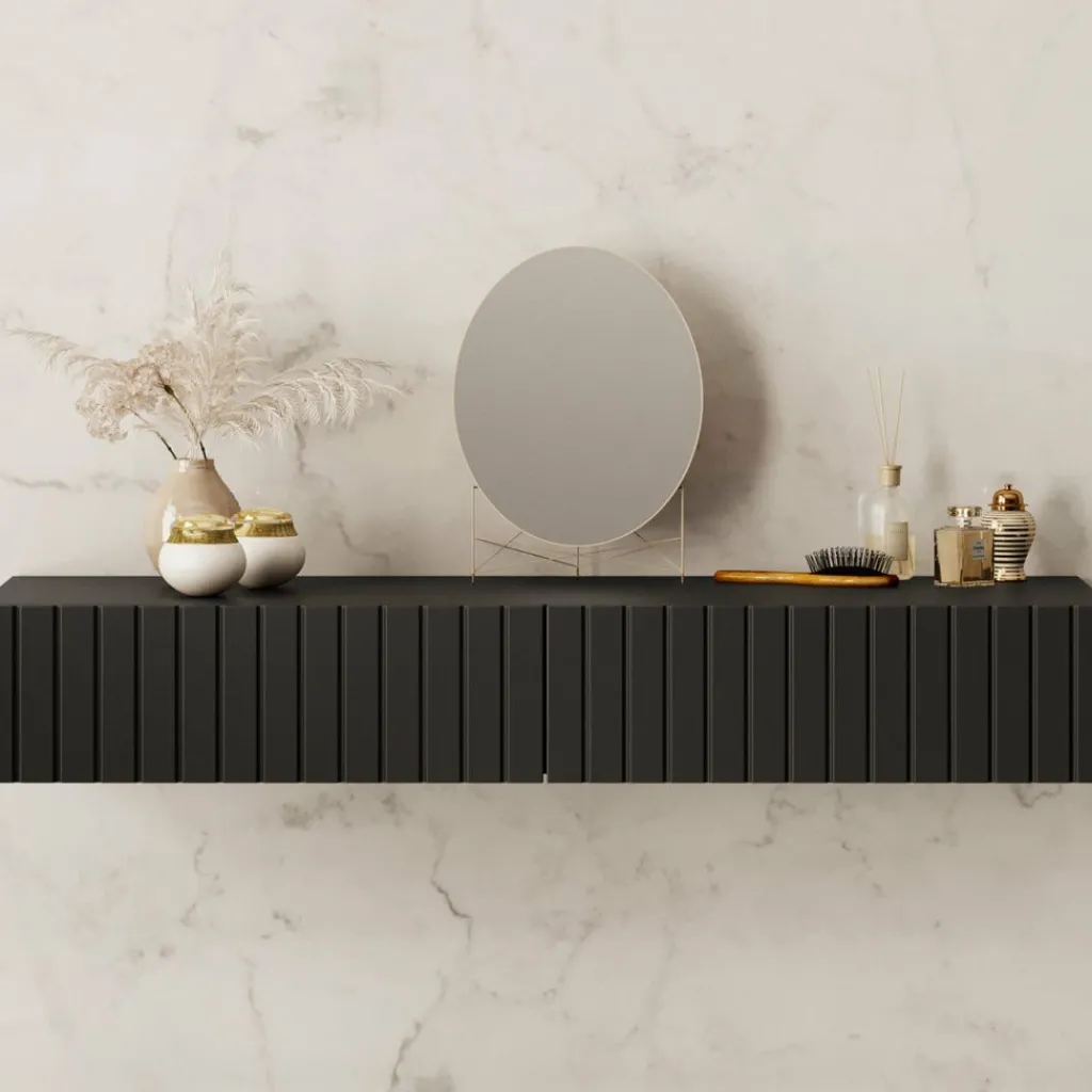De kaptafel beschikt over 2 greeploze opberglades. Het blad is 100×41 cm en biedt daardoor genoeg plek voor alle make-up, sieraden en accessoires. Dit model is aan de muur op te hangen en bespaard hierdoor een hoop ruimte in jouw slaapkamer.