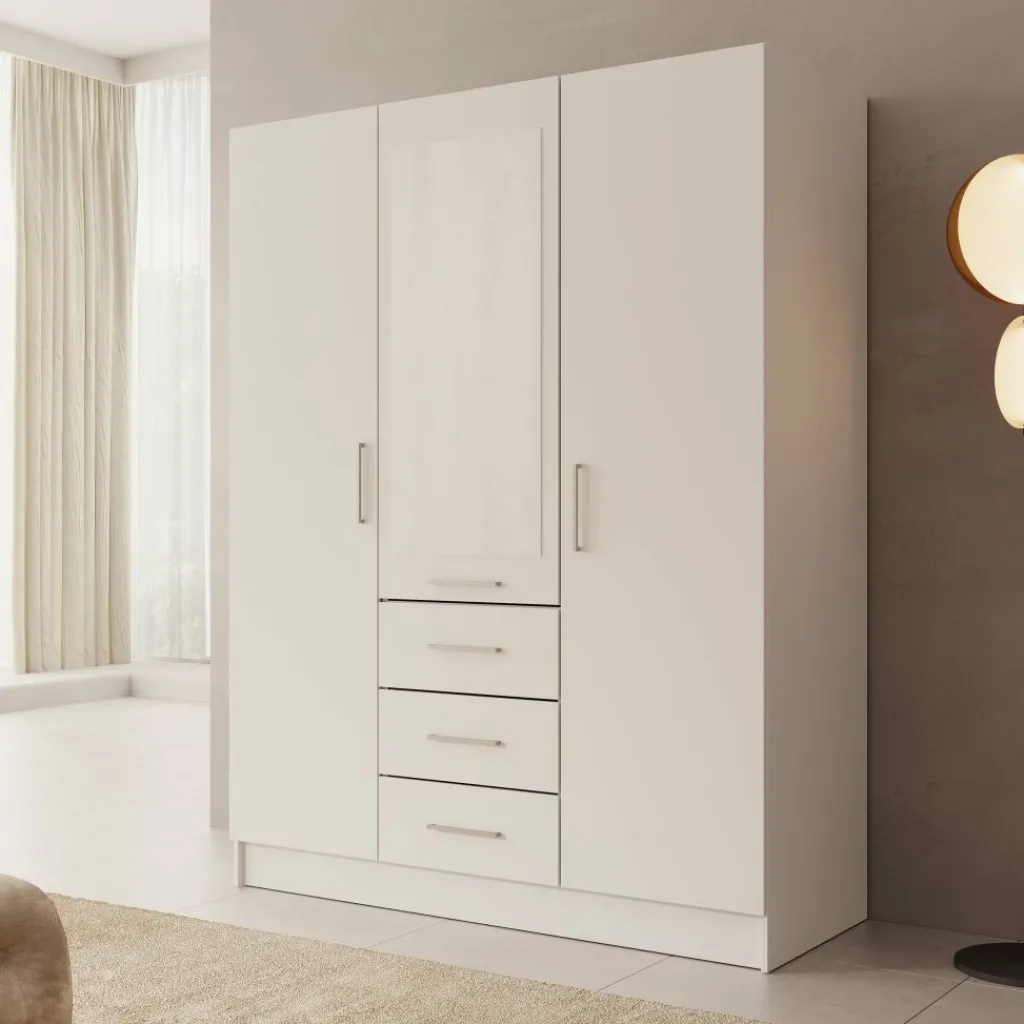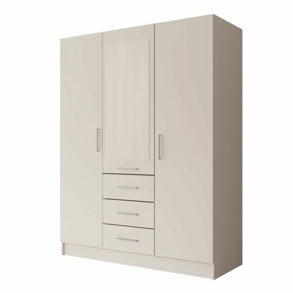 De Komodo kledingkast met 3 deuren in beige biedt veel opbergruimte en een overzichtelijke indeling. De kast heeft een breed hanggedeelte en vier lades voor gevouwen kleding of accessoires. Dankzij de afmetingen van 151x61x201 cm is dit een praktisch meubel voor de slaapkamer. De metalen handgrepen zorgen voor een strak en functioneel ontwerp.