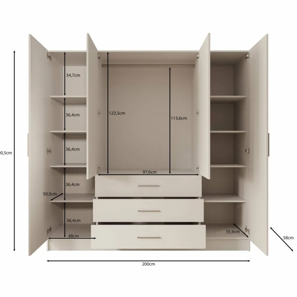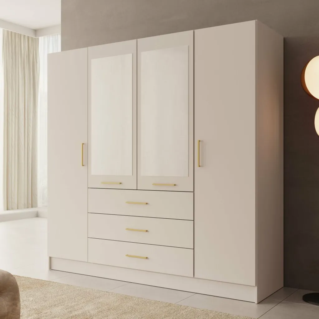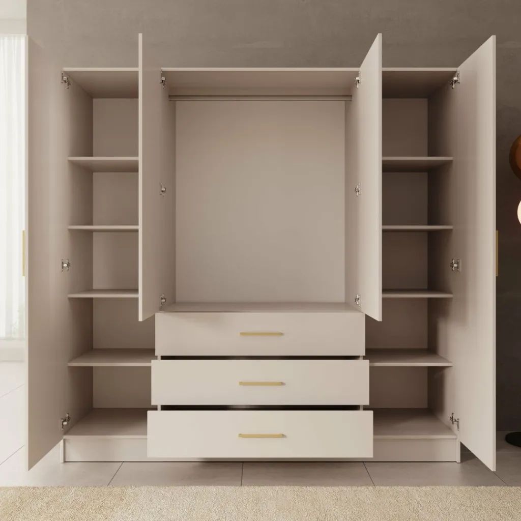 De Komodo kledingkast met 4 deuren in wit biedt ruime opbergmogelijkheden voor kleding en accessoires. De kast heeft twee brede hanggedeeltes en vier lades voor gevouwen kleding. Met een afmeting van 200x61x201 cm is dit een praktische en overzichtelijke kast voor grotere slaapkamers. De metalen handgrepen zorgen voor een eenvoudig en strak uiterlijk.