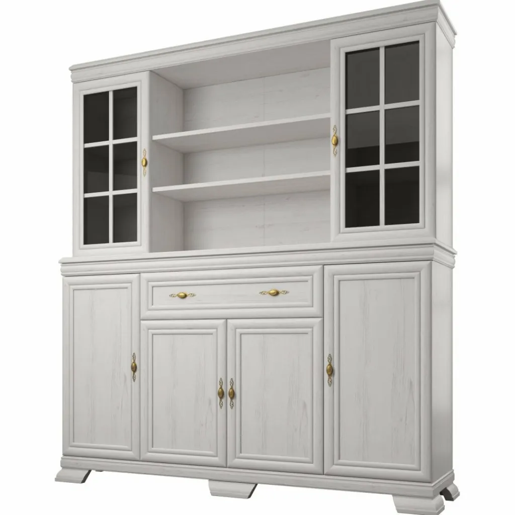 Buffetkast Kresto is een staande buffetkast met ruime opbergmogelijkheden. Vanwege zijn landelijke uitstraling is de Kresto passend in een landelijke, maar ook industriële of strakke living. De onderkant van de buffetkast beschikt over 4 deuren met daarachter schappen. De handgrepen zijn gemaakt van geborsteld staal en geven de kast een stoere look. In het midden bevindt zich een opberglade. In het bovenste deel van de kast zitten 9 open schappen waarvan de buitenste voorzien zijn van deuren met glas. De buffetkast Kresto is 168 cm breed.