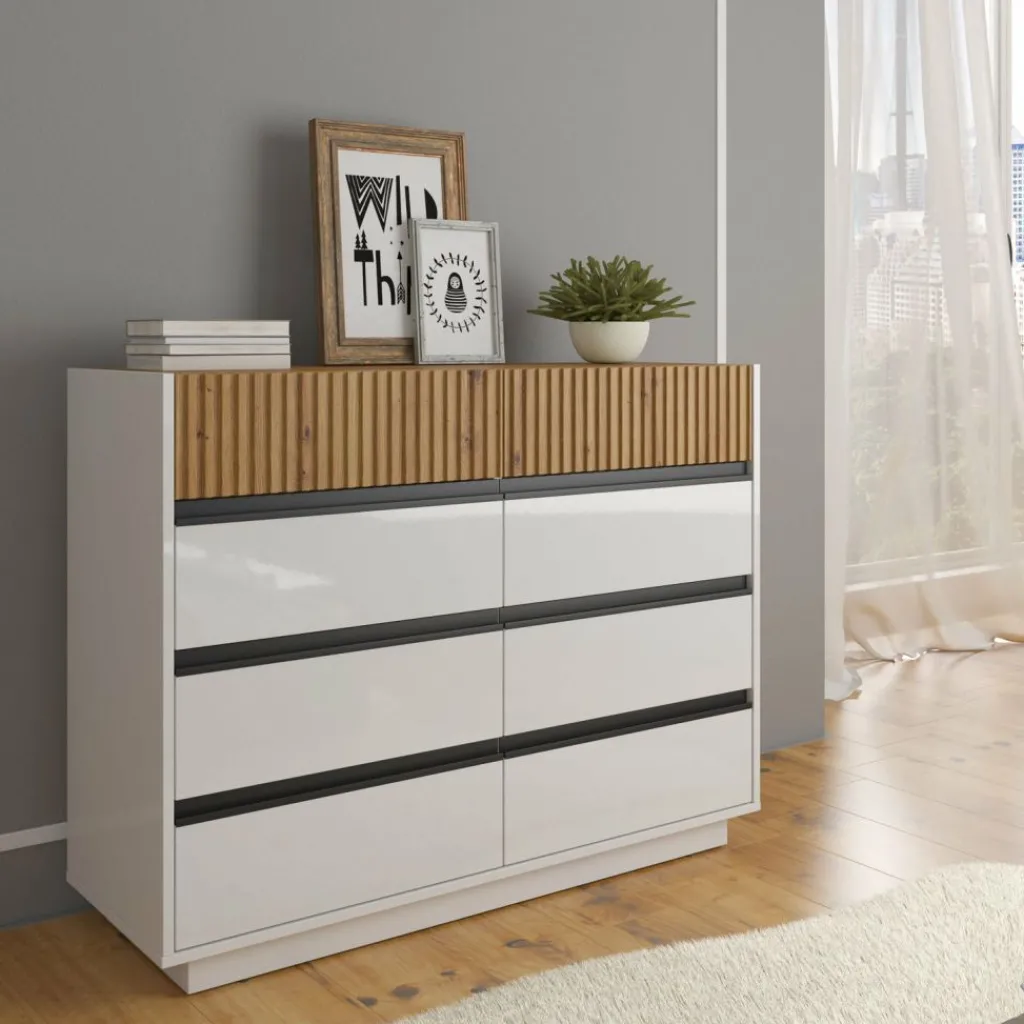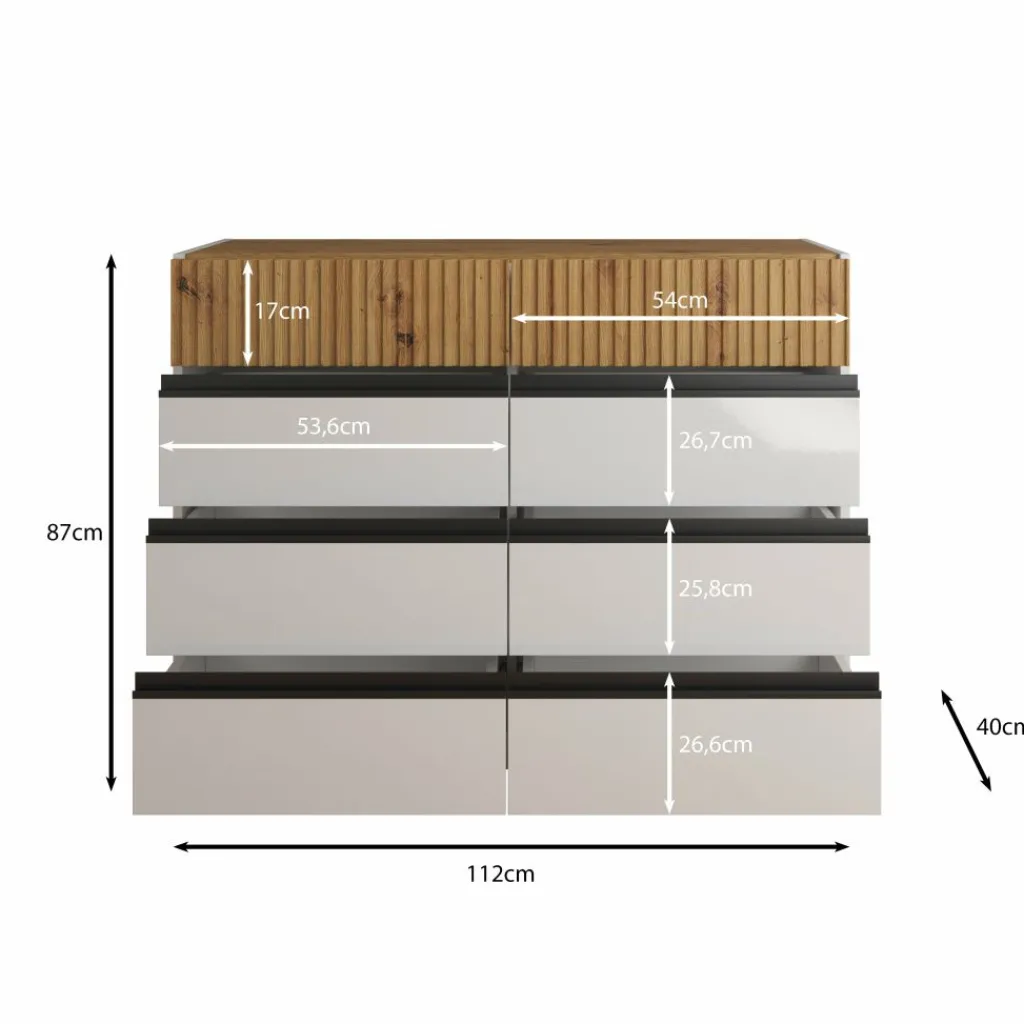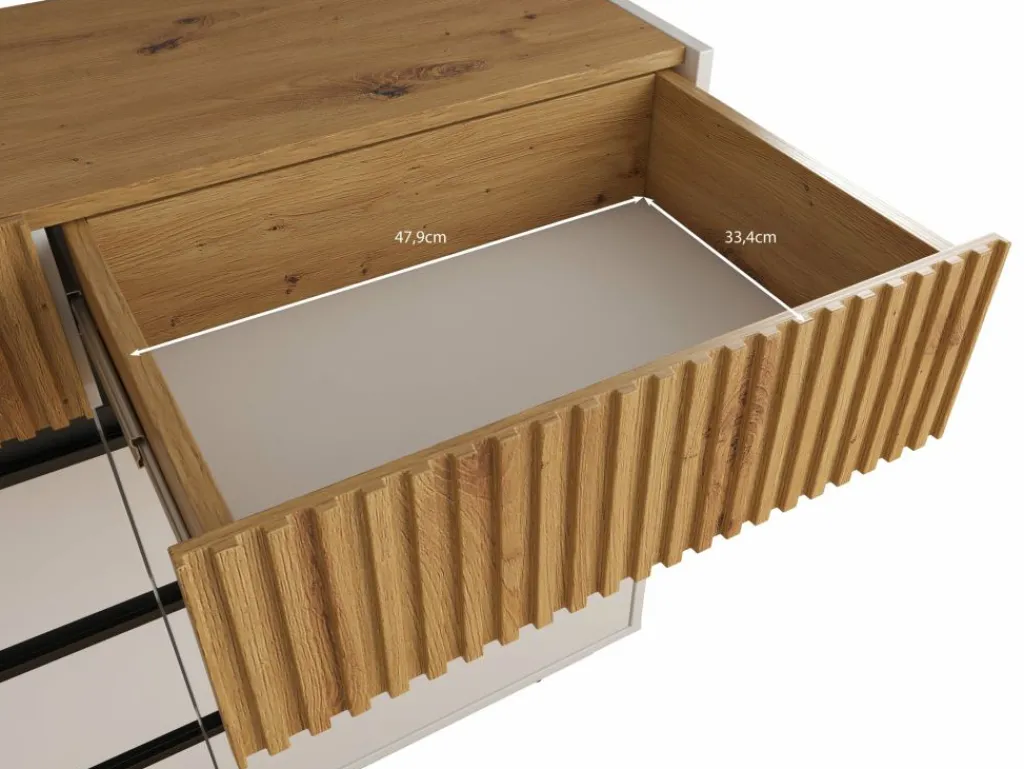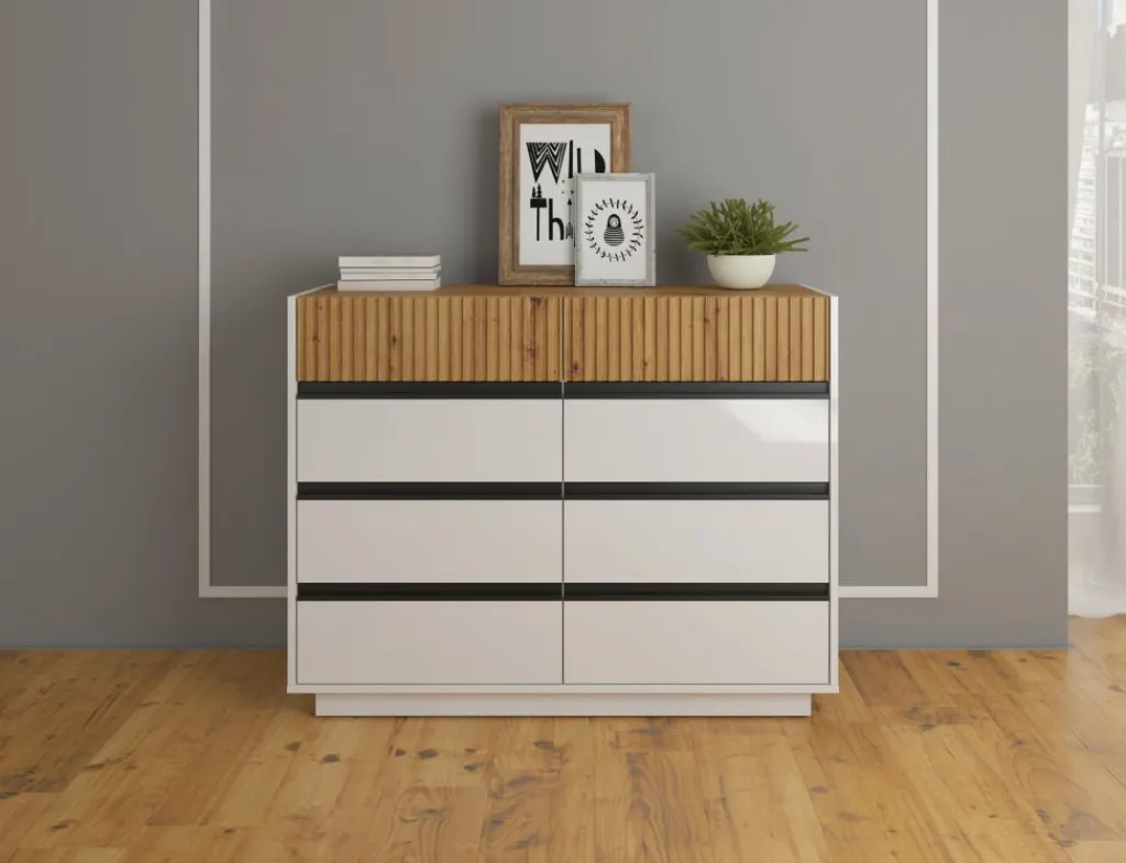 Ladekast Madeline is een opbergkast in een moderne stijl en beschikt over 8 greeploze lades. De bovenste 2 lades hebben op de voorkant een latten patroon. Het meubel is uitgevoerd in de kleuren wit met eiken. De voorkant van de onderste 6 lades zijn afgewerkt in een hoogglans witte kleur.