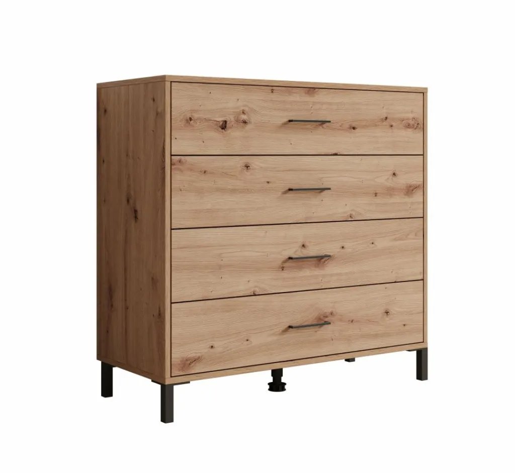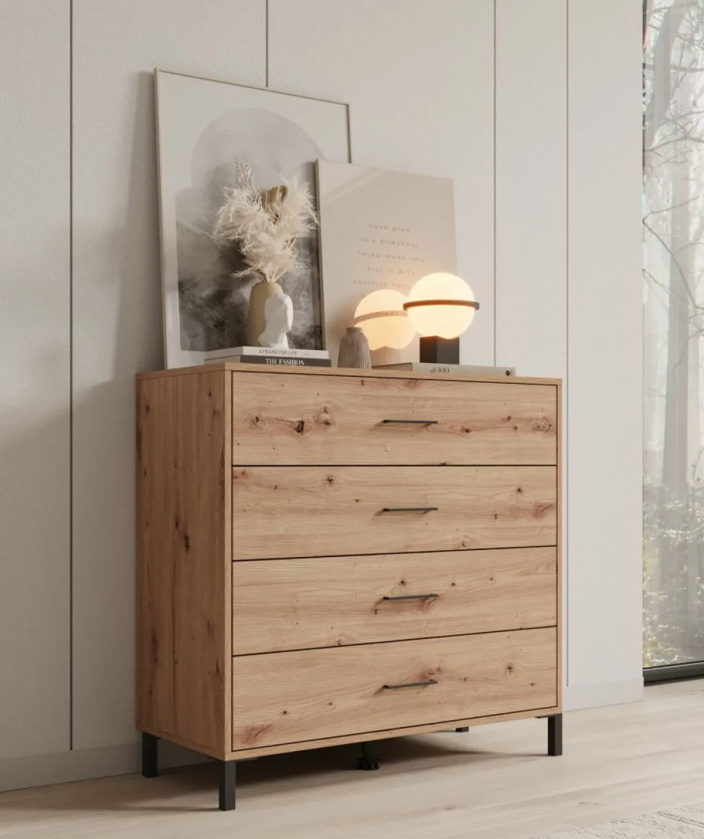Ladekast Vidor is een opbergkast in een moderne stijl. De kast beschikt over 4 lades die openen met zwarte handgrepen. Het meubel is uitgevoerd in de kleur eiken met zwarte poten.
