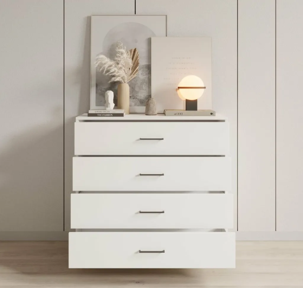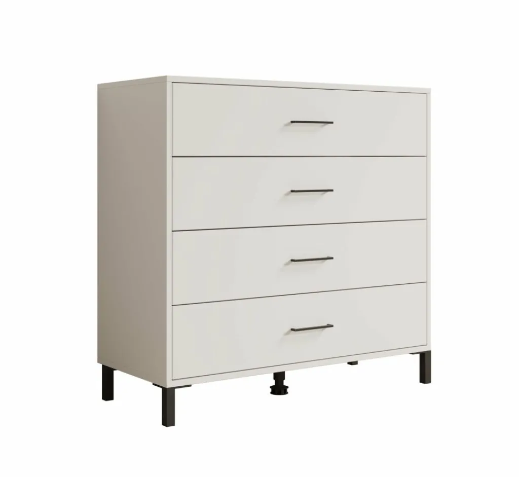 Ladekast Vidor is een opbergkast in een moderne stijl. De kast beschikt over 4 lades die openen met zwarte handgrepen. Het meubel is uitgevoerd in de kleur wit met zwarte poten.