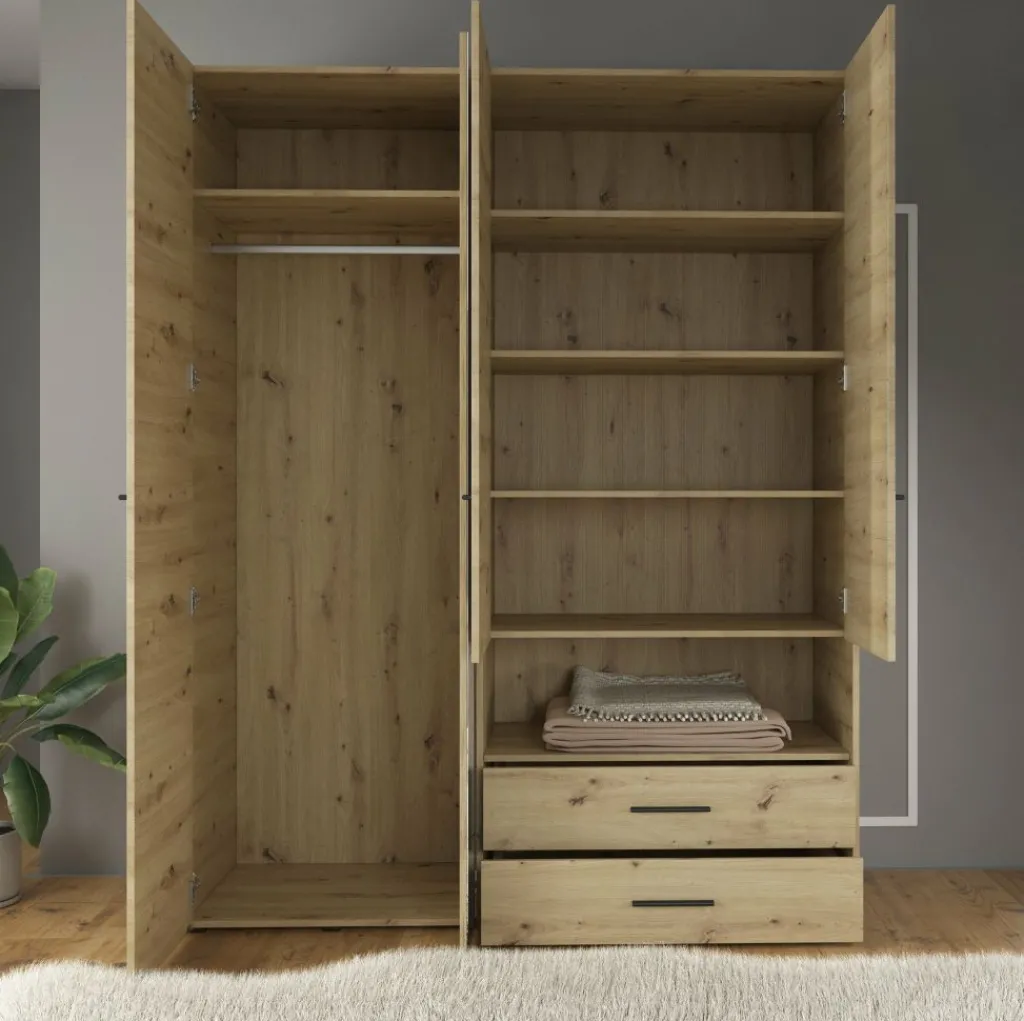 Kledingkast Laura is een garderobekast met ruime opbergmogelijkheden. Dit model is voorzien van 4 deuren, 2 brede lades en een open schap. Eén deur is volledig voorzien van een handige spiegel. Het binnenwerk bestaat uit legplanken en een ruimte met stang om kleding aan op te hangen. Dit model is afgewerkt in eiken kleur met zwarte details.