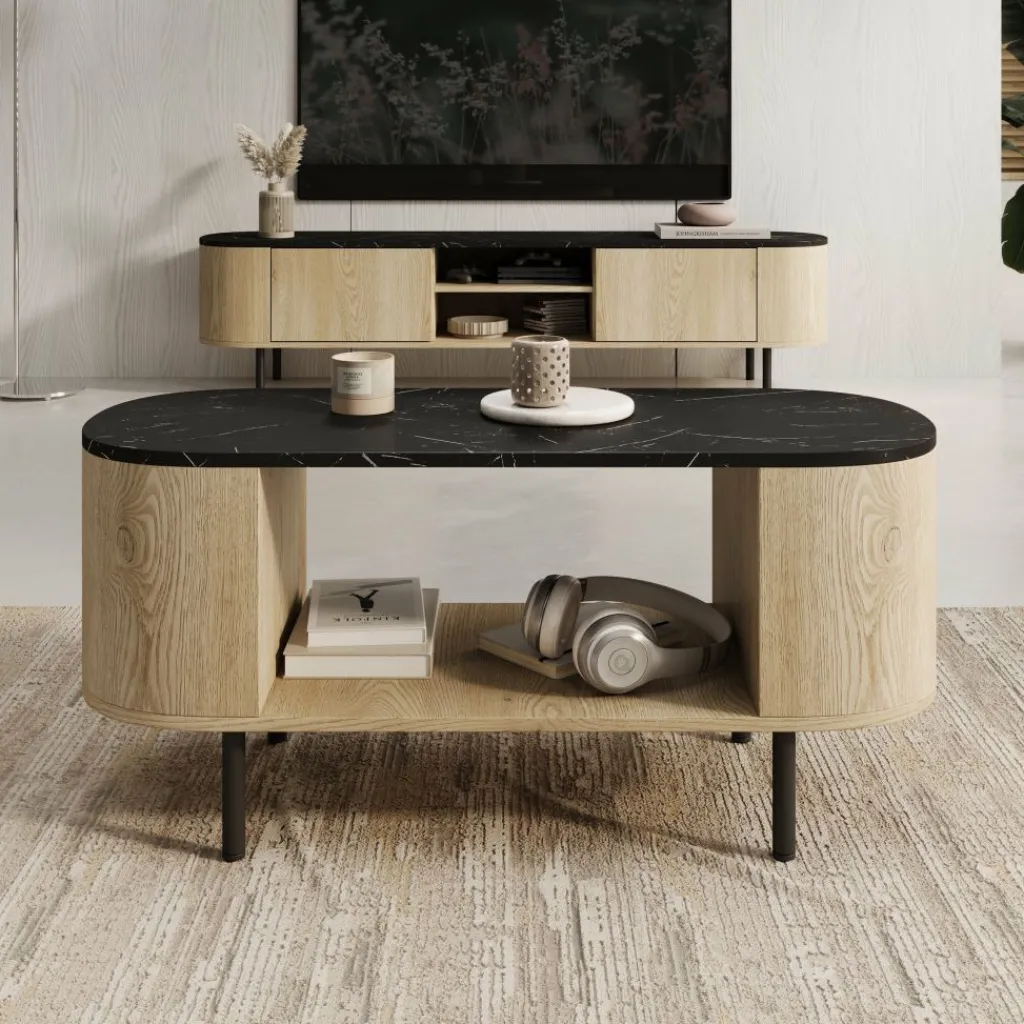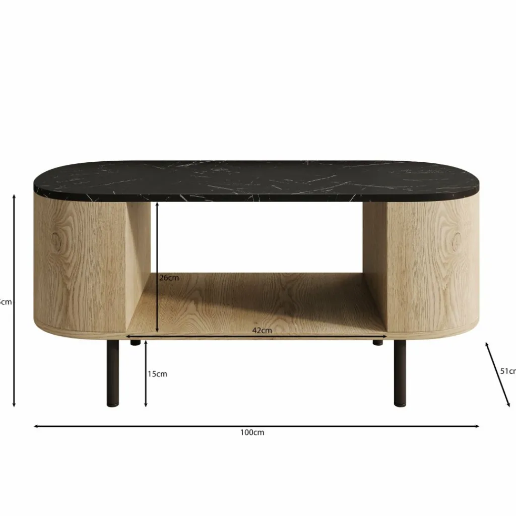 De Lauran salontafel van Meubella is uitgevoerd in eikenlook met een zwart marmerlook tafelblad en heeft een afmeting van 100 x 51 x 45 centimeter. De tafel heeft afgeronde hoeken en een open opbergvak onder het blad. Het tafelblad heeft een zwart marmerlook afwerking en het onderstel bestaat uit metalen poten.
