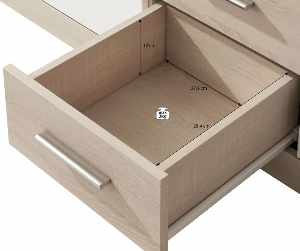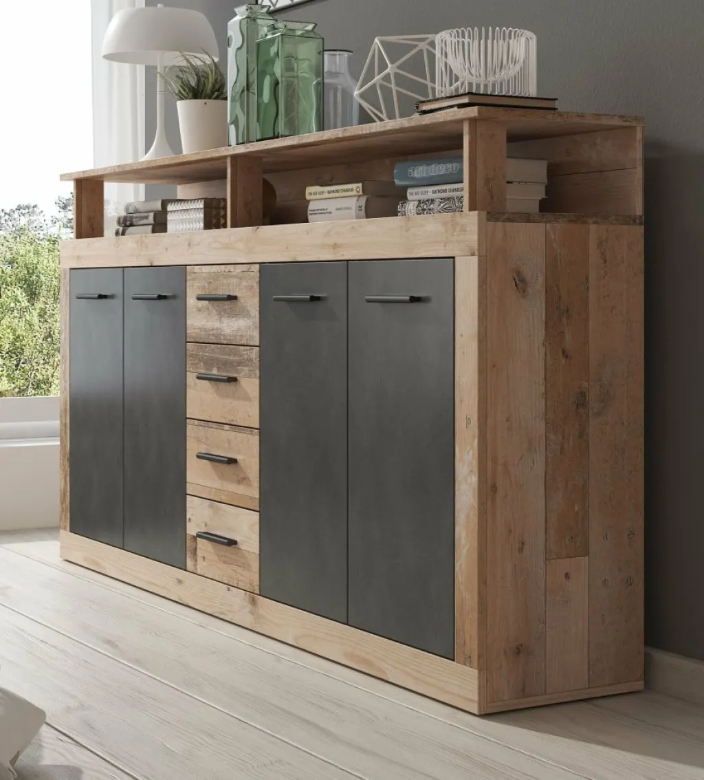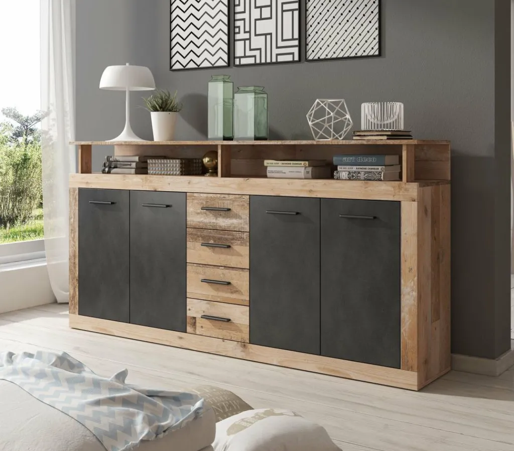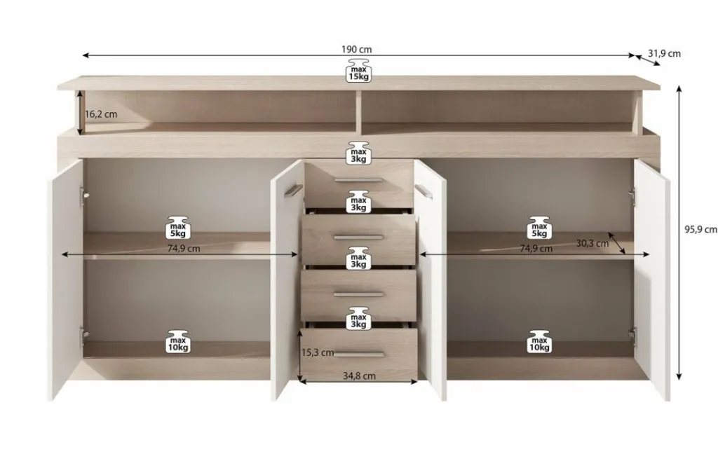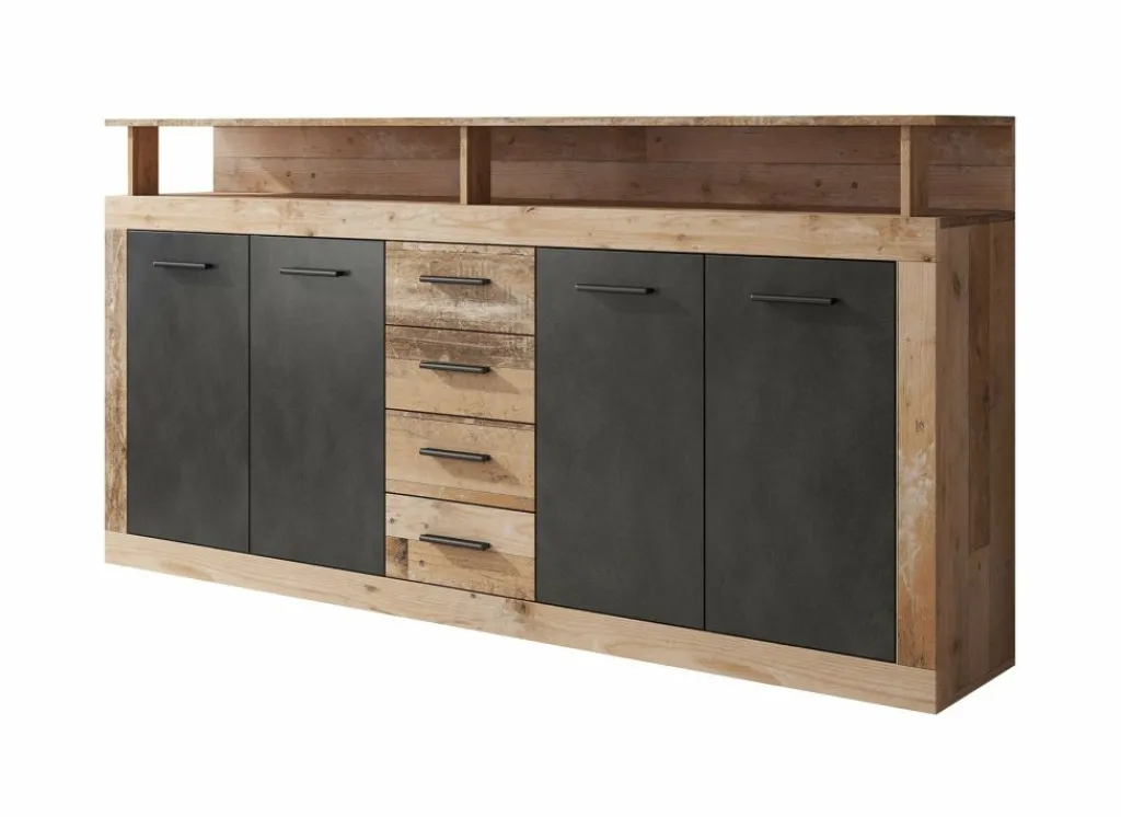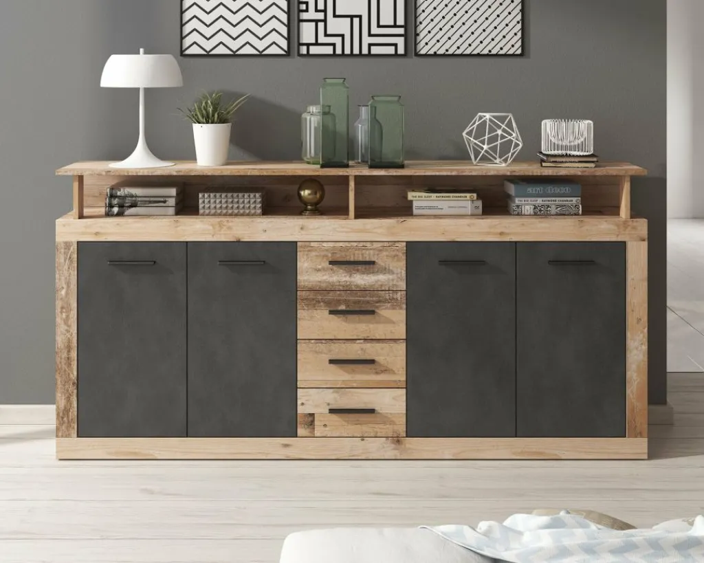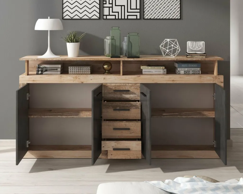 De kast is uitgerust met vier deuren en vier lades, waardoor je zowel grote als kleine spullen overzichtelijk kunt opbergen. De open vakken aan de bovenkant geven extra ruimte voor boeken, accessoires of woondecoratie, waarmee je het dressoir een persoonlijke touch geeft.