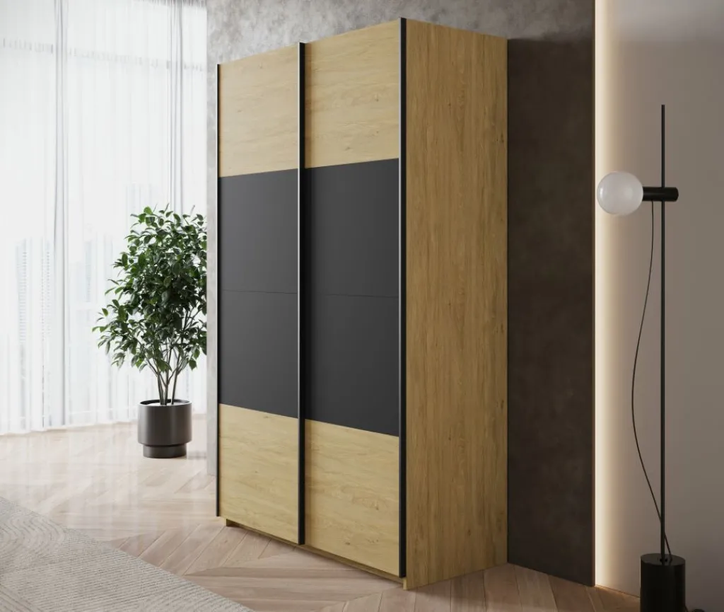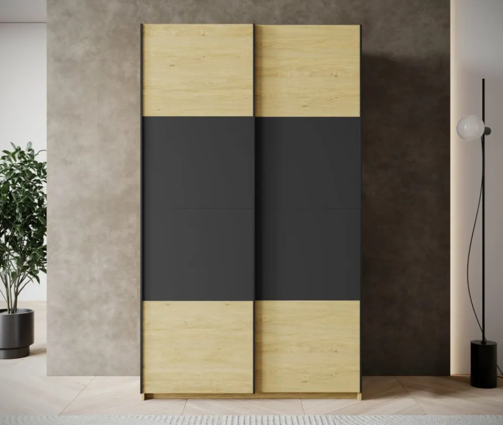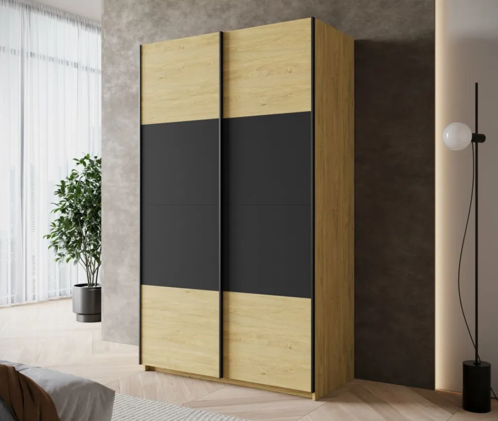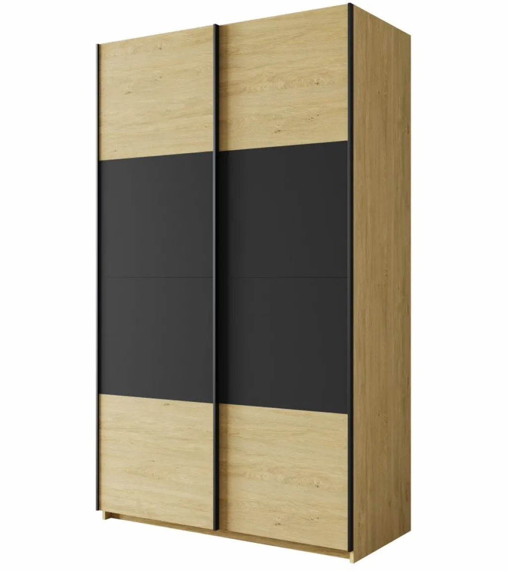 Kledingkast Lawson is een praktische schuifdeurkast met een warme eiken uitstraling en strakke zwarte accenten. Met een breedte van 120 cm is deze kast ideaal voor compacte slaapkamers, logeerkamers of als extra opbergruimte in huis.