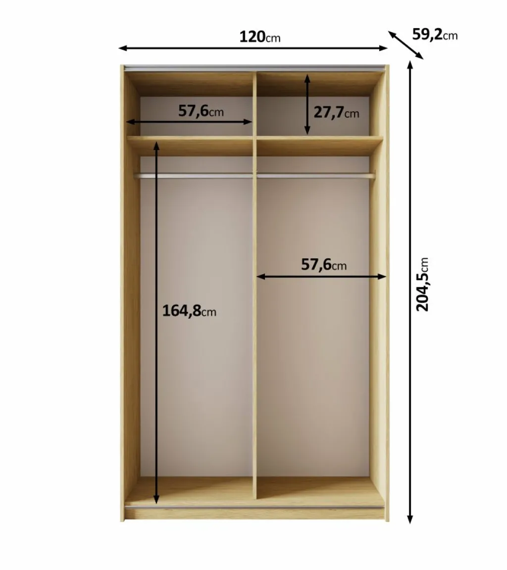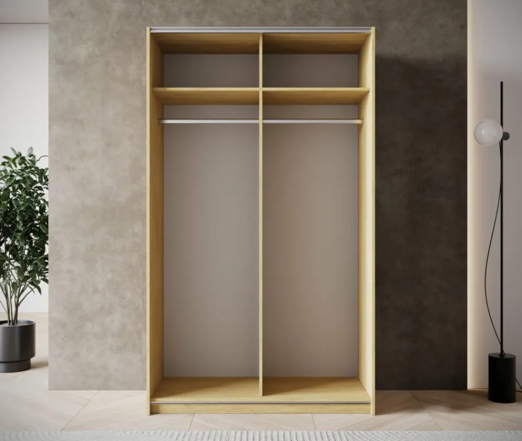 Achter de twee schuifdeuren vind je een overzichtelijke indeling met twee hanggedeeltes en een legplank boven elk compartiment. Dankzij de royale hoogte van 204,5 cm is er voldoende ruimte voor het netjes ophangen van kleding. De roede is geschikt om je kleding uit te hangen. De legplanken zijn perfect voor bijvoorbeeld truien, beddengoed of dozen.
