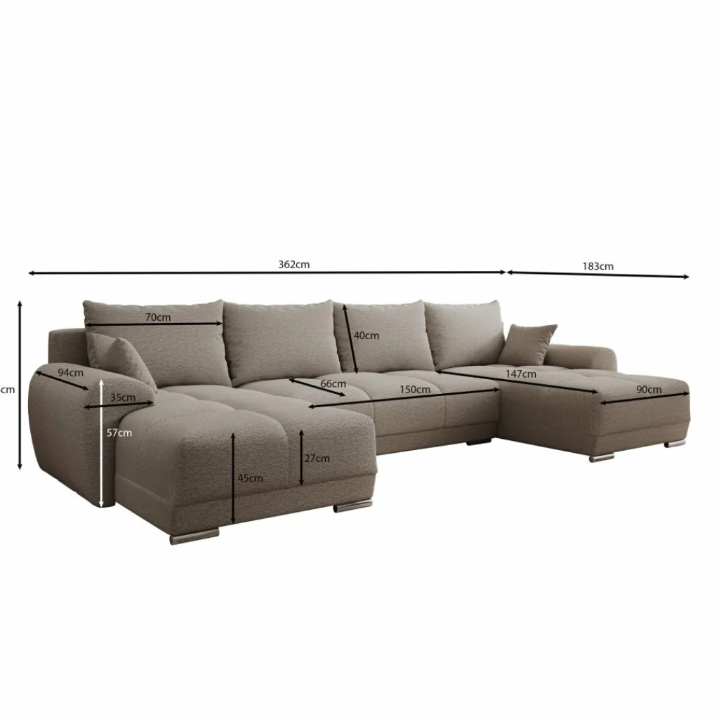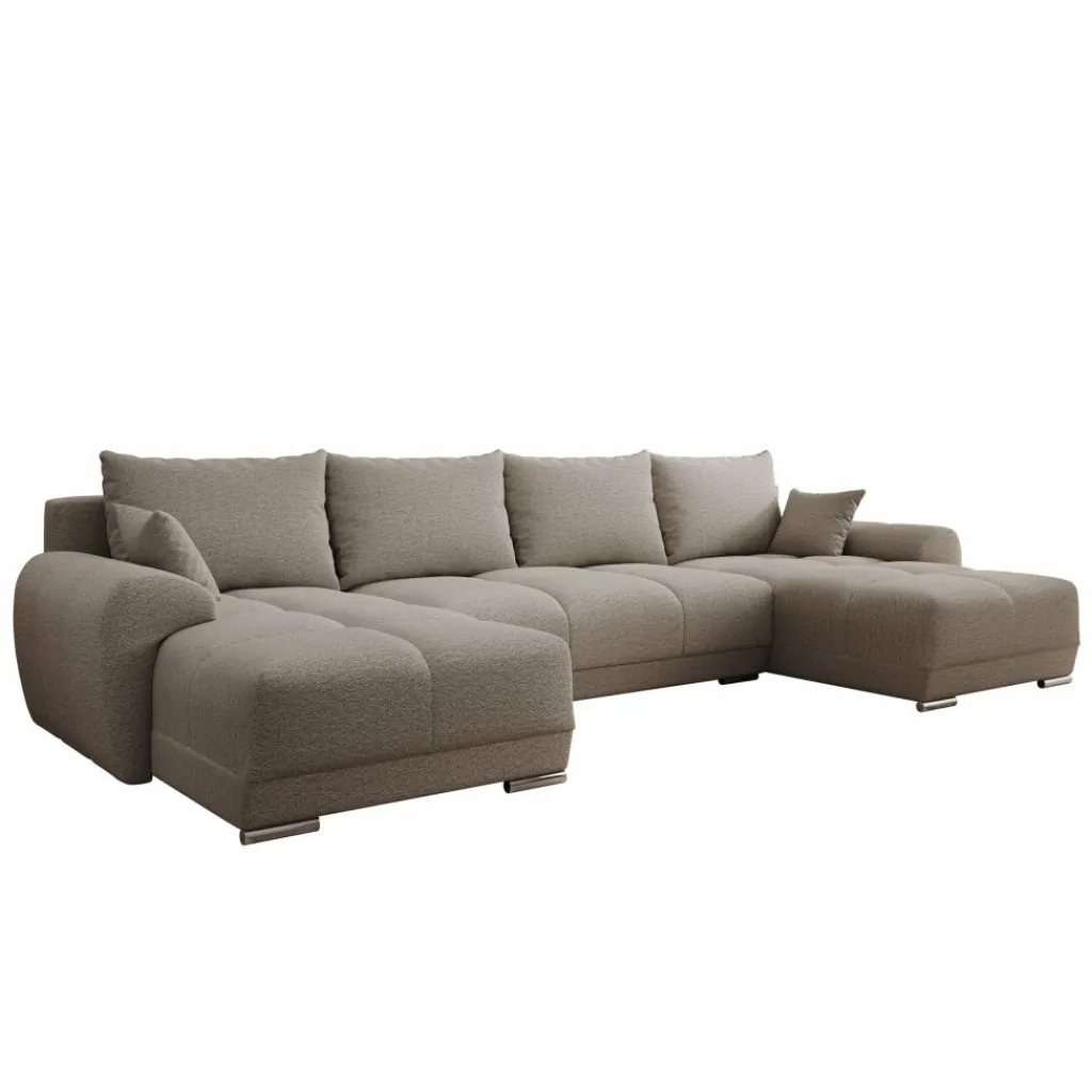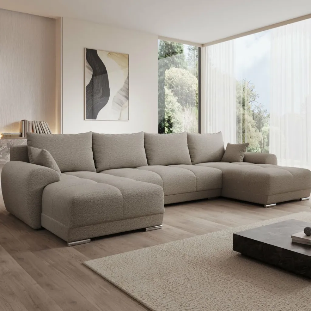 Hoekbank Layana U is een symmetrische hoekbank in U-vorm geschikt voor 4 tot 6 personen. De bank bestaat uit twee chaise-longues met in het midden een 2-zitter. De Layana U is bekleed met een zachte stof in beige kleur. De bank staat op cilindervormige pootjes.