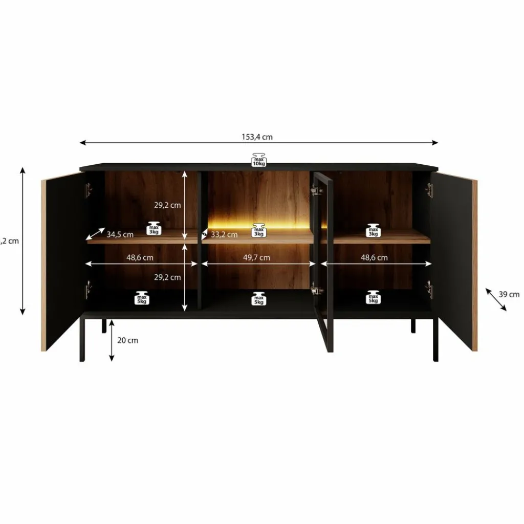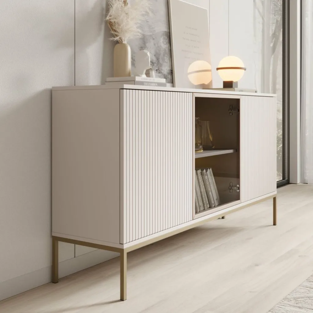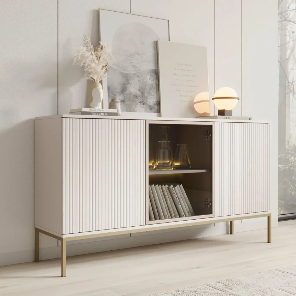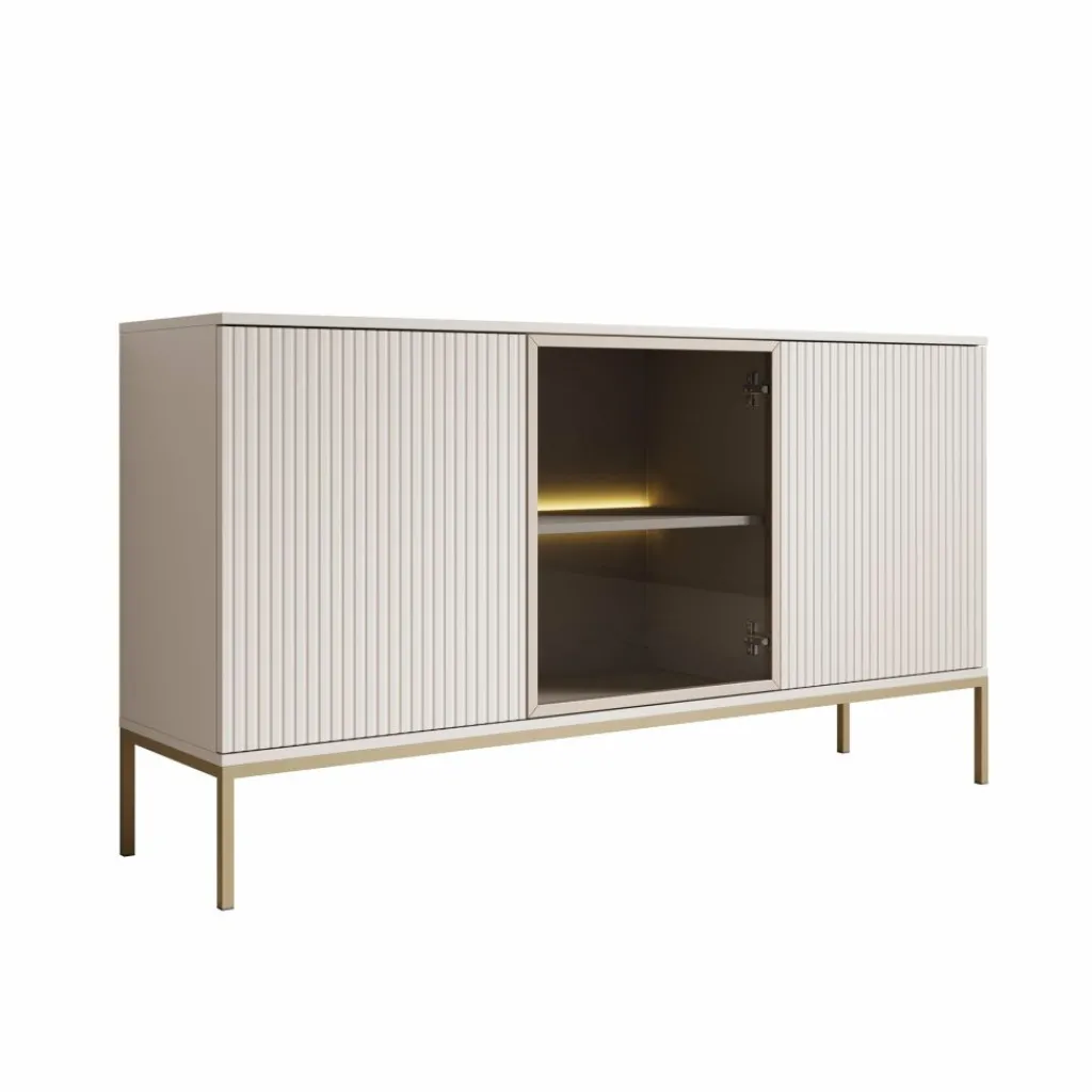 De kast heeft drie deuren met daarachter zes opbergvakken. De deuren zijn greeploos. De buitenste deuren hebben een latten patroon. De deur in het midden beschikt over getint glas. Achter het glas zit een plank welke wordt verlicht door de meegeleverde LED-verlichting.