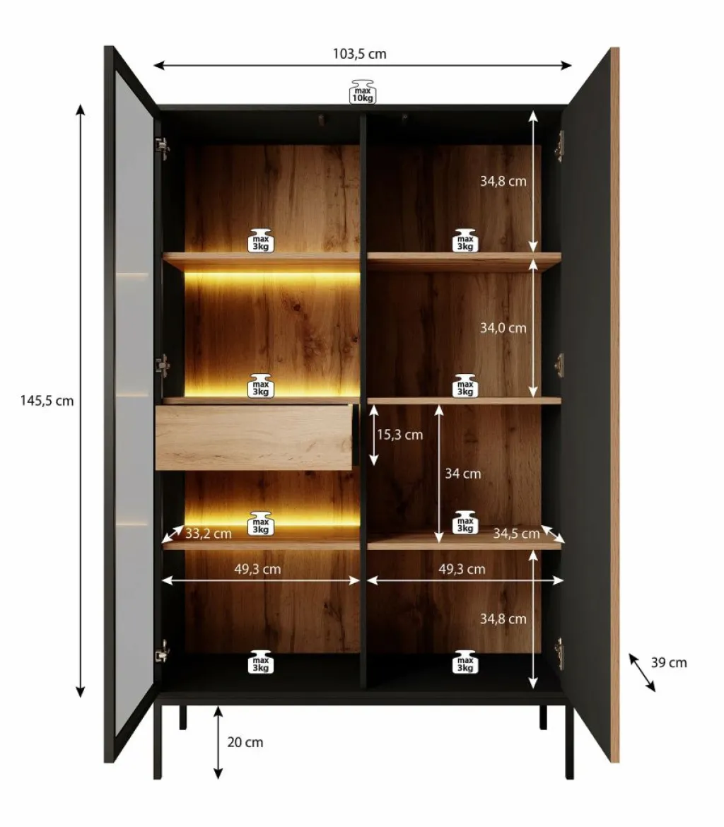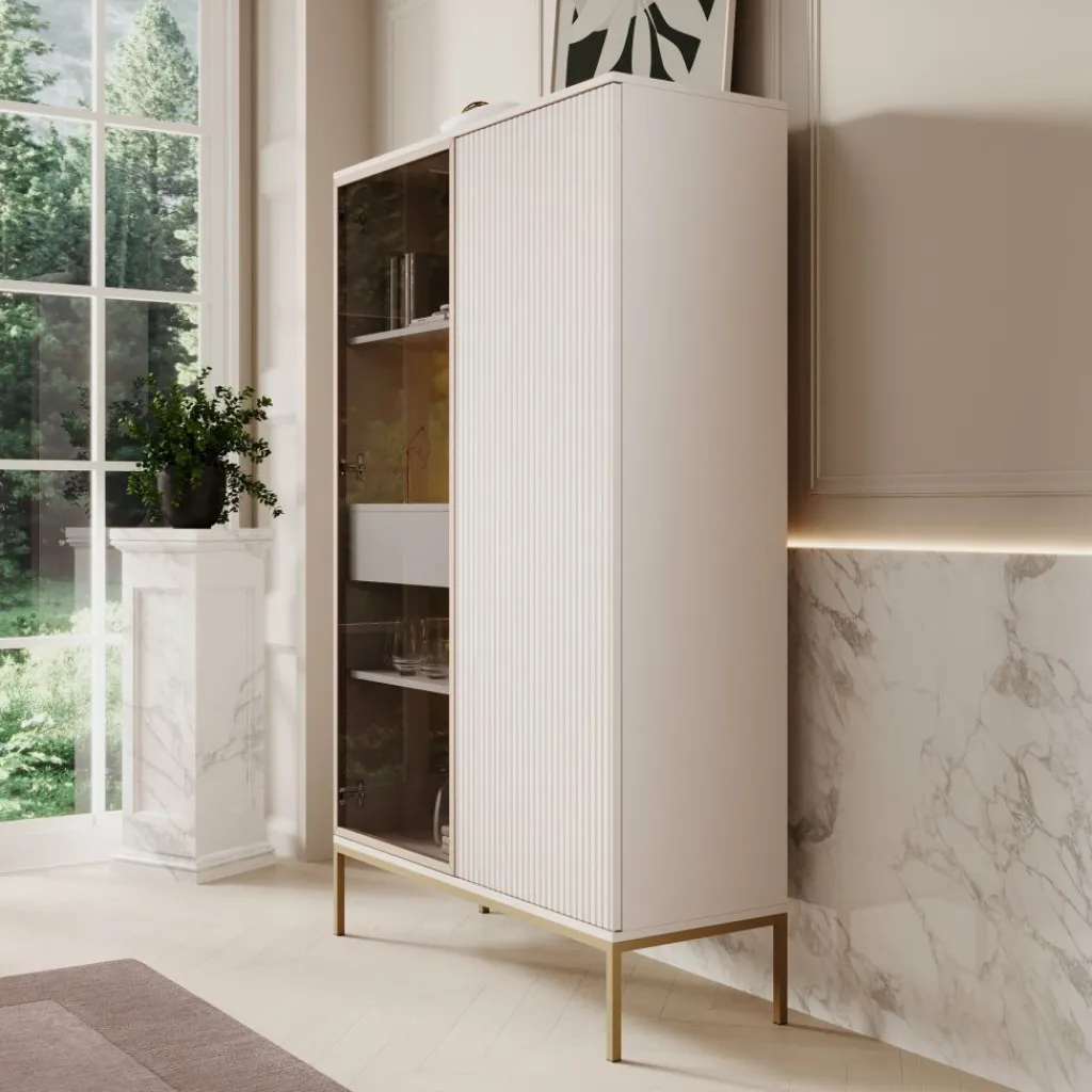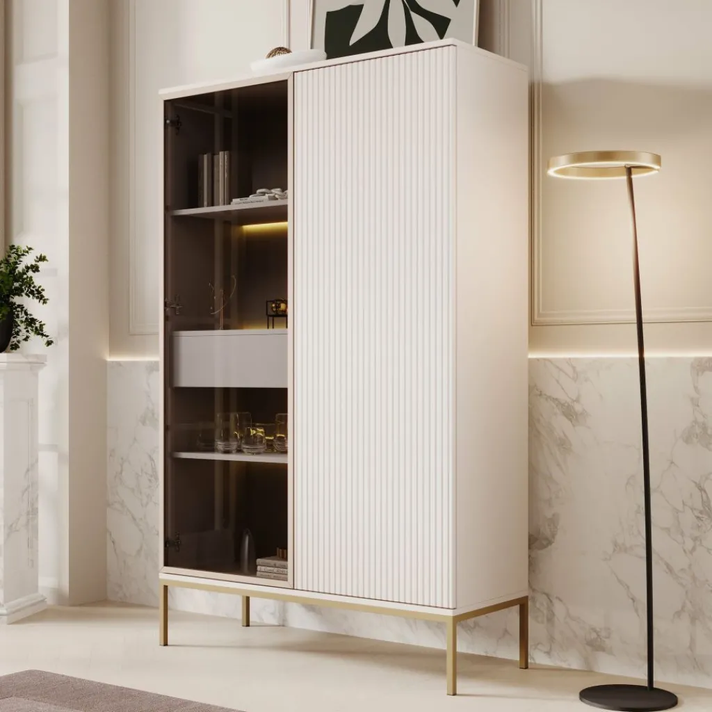 De Legend vitrinekast biedt een combinatie van presentatie- en opbergruimte. Links bevindt zich een glazen deur met geïntegreerde LED-verlichting en legplanken, verdeeld in meerdere compartimenten die geschikt zijn voor het uitstallen van servies, glaswerk of decoratieve items.