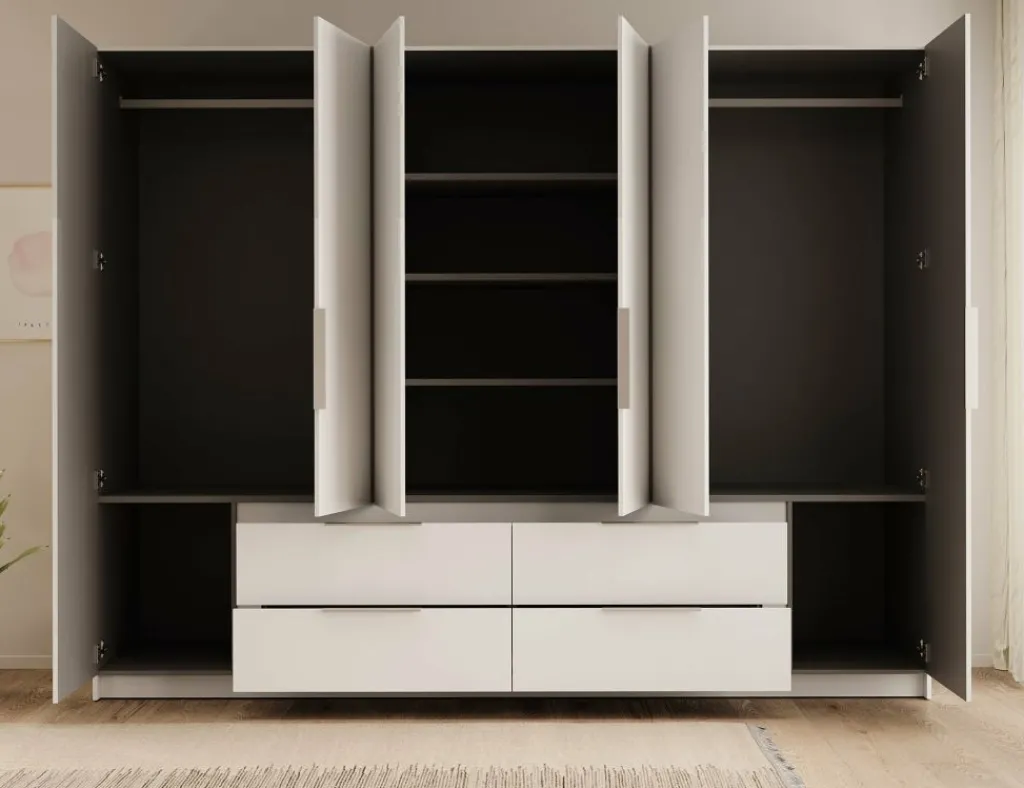 De binnenkant van de kledingkast is voorzien van 2 kledingroedes en 6 opbergvakken, zodat je al je kleding netjes kunt opbergen en organiseren.