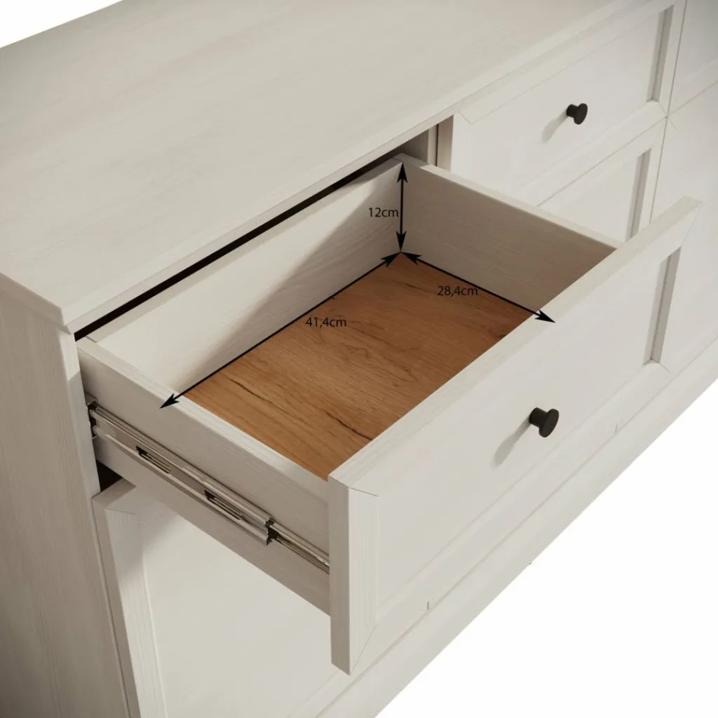 Dressoir Leroy is een opbergkast in een landelijke stijl. De kast beschikt over 3 deuren en 3 lades die openen met goudkleurige knoppen. Achter de deuren zijn nog 6 opbergvakken te vinden. Het meubel is volledig uitgevoerd in een zwart eiken kleur.