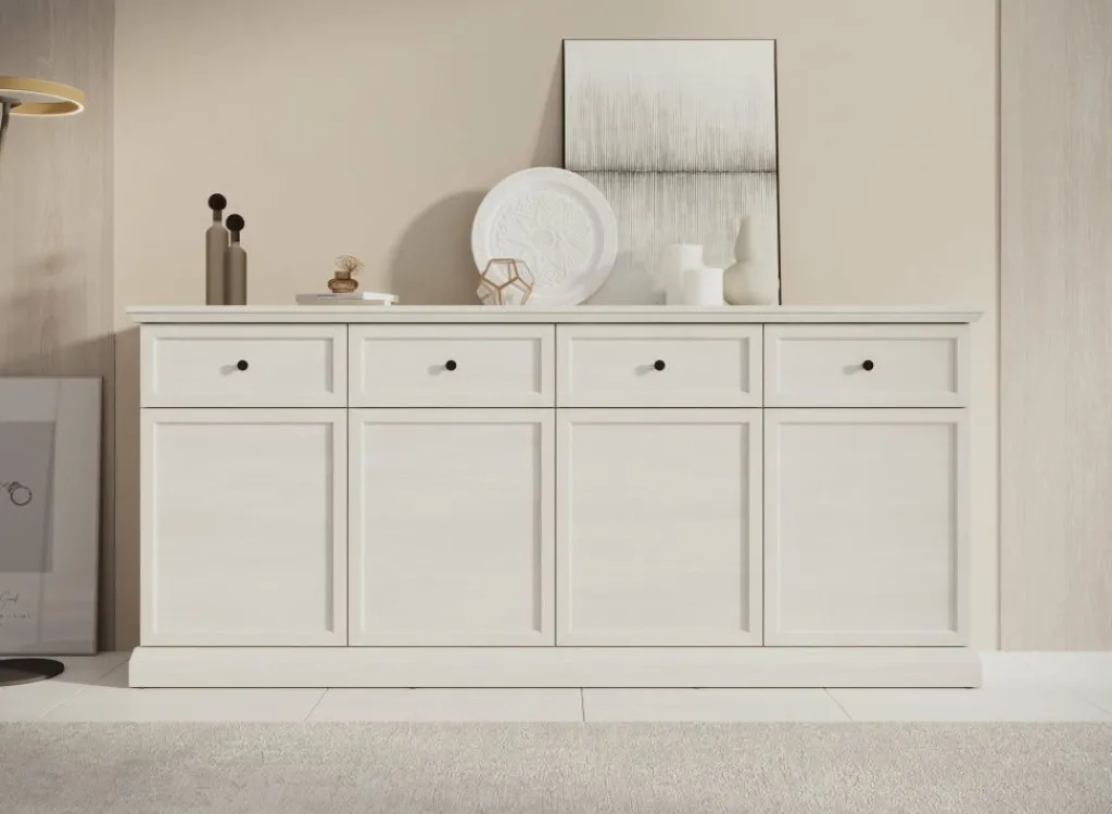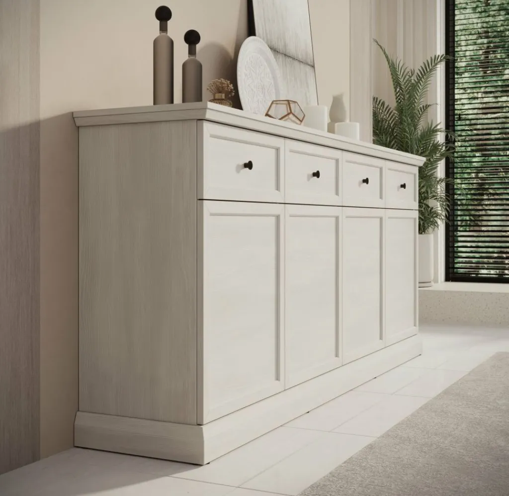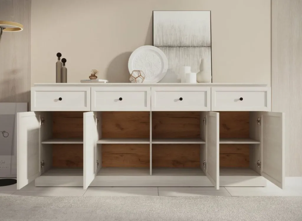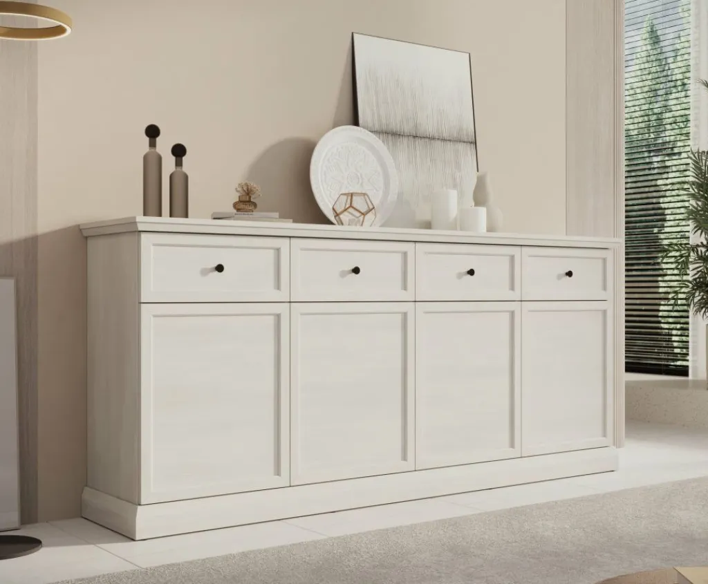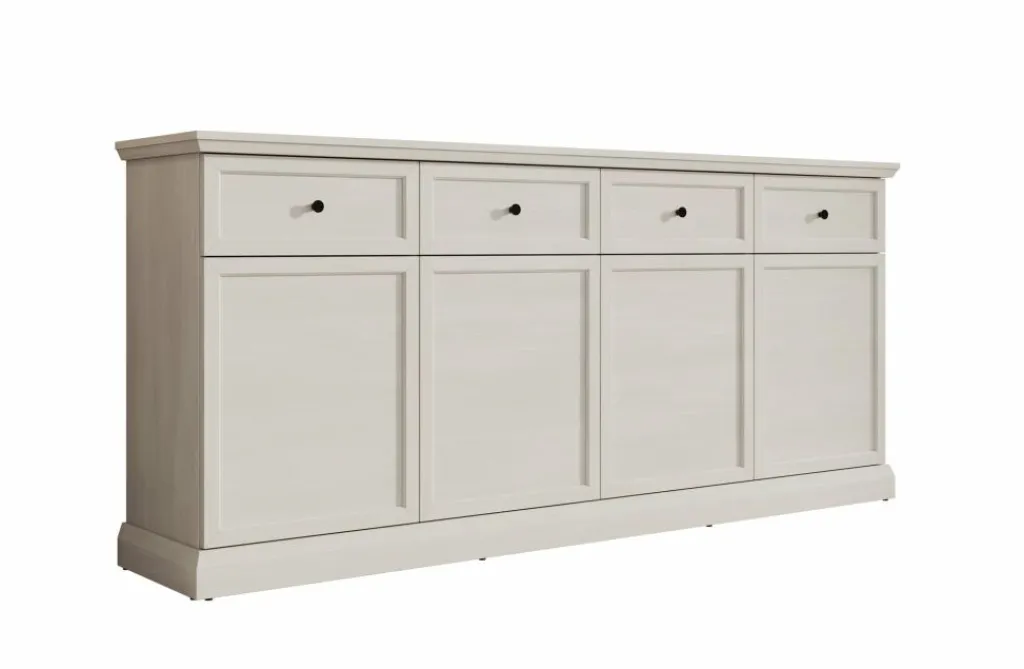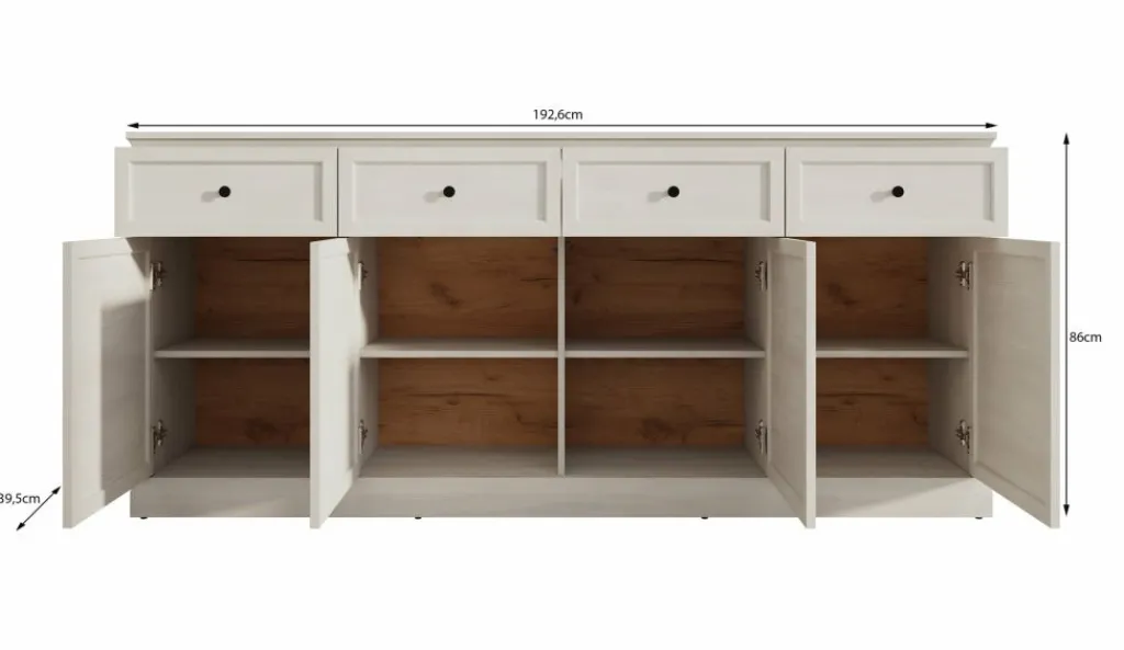 Dressoir Leroy is een opbergkast in een landelijke stijl. De kast beschikt over 4 deuren en 4 lades die openen met zwarte knoppen. Achter de deuren zijn nog 8 opbergvakken te vinden. Het meubel is volledig uitgevoerd in een wit eiken kleur.