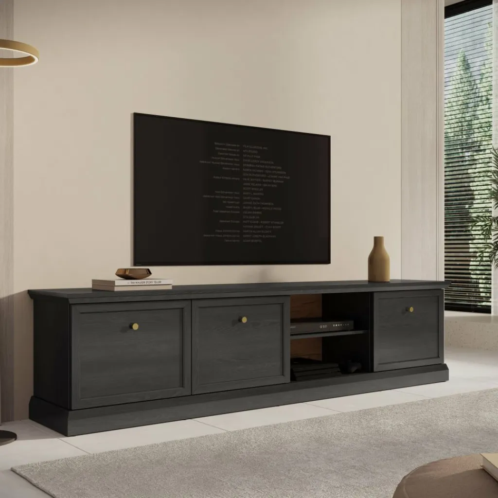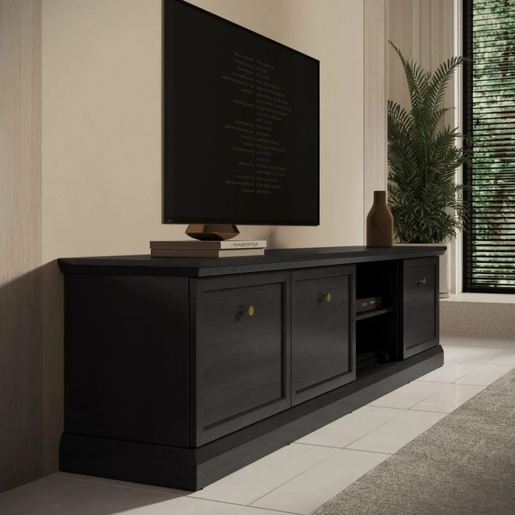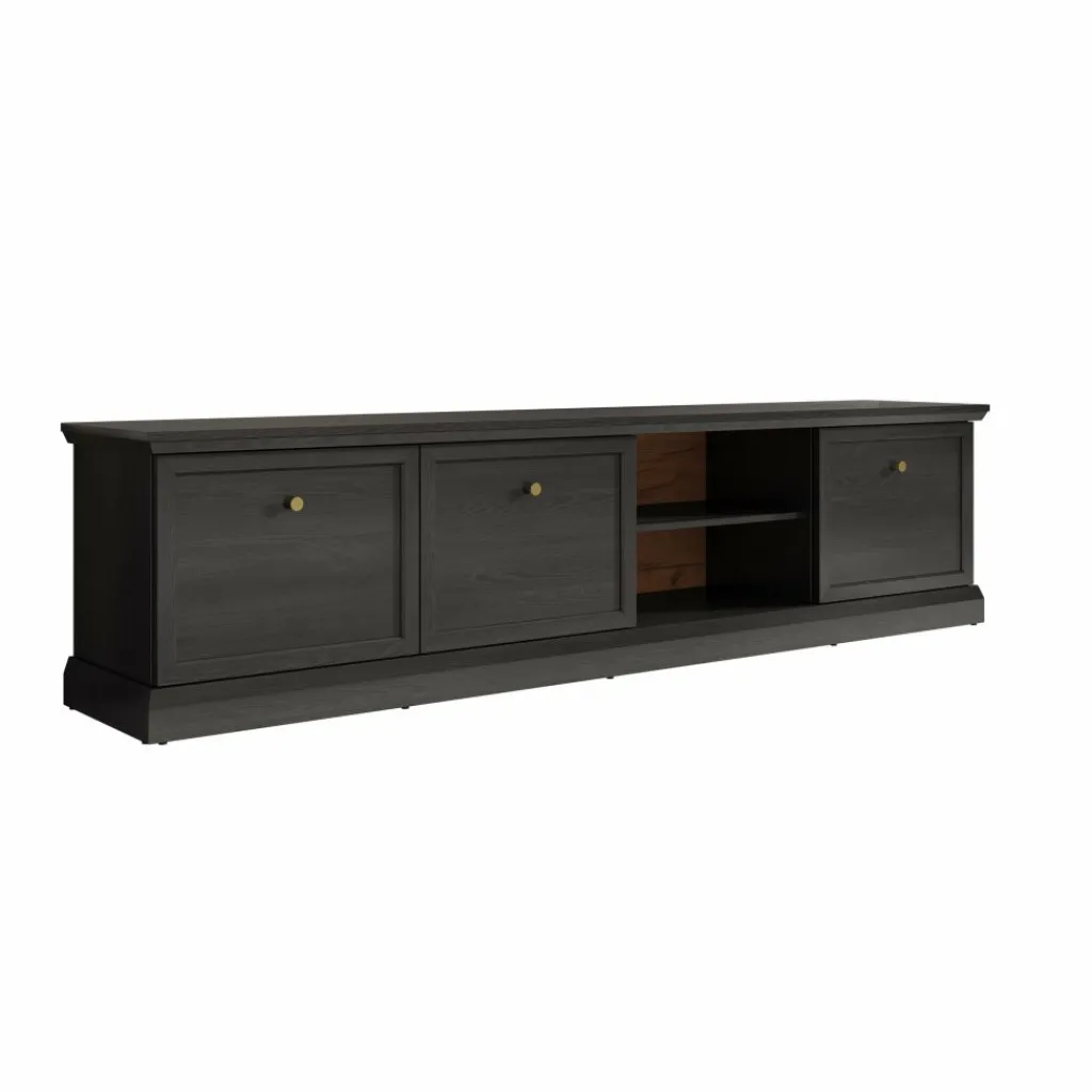 TV-Meubel Leroy is een opbergkast voor onder de tv in een landelijke stijl. De TV-kast is gemaakt in een zwart eiken kleur. De Leroy beschikt over 3 deuren die openen met goudkleurige knoppen. Achter deze deuren zitten in totaal 6 opbergvakken. Ook heeft het meubel nog 2 extra open vakken, hier zit in de achterwand een uitsparing om eventuele bedrading weg te werken.