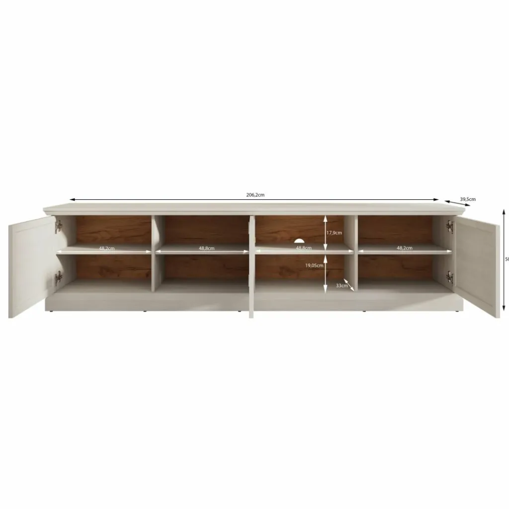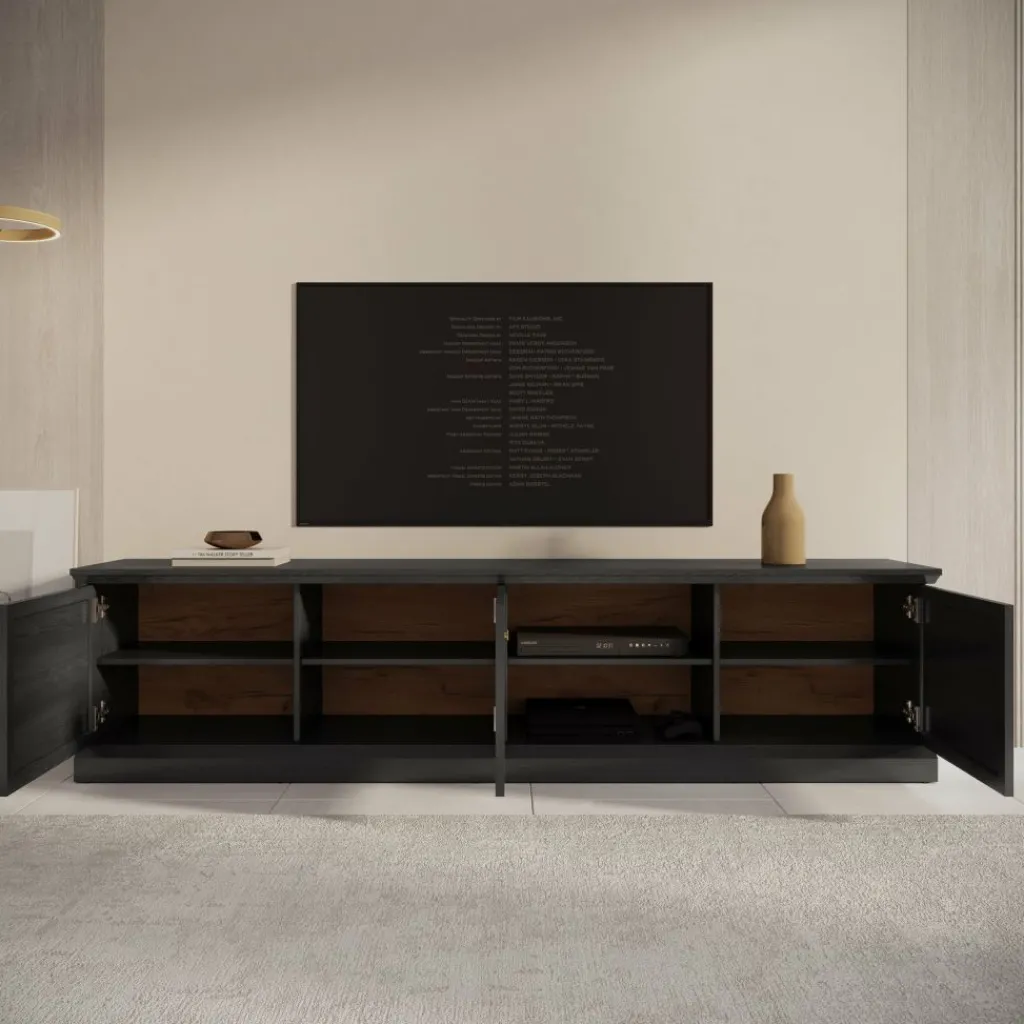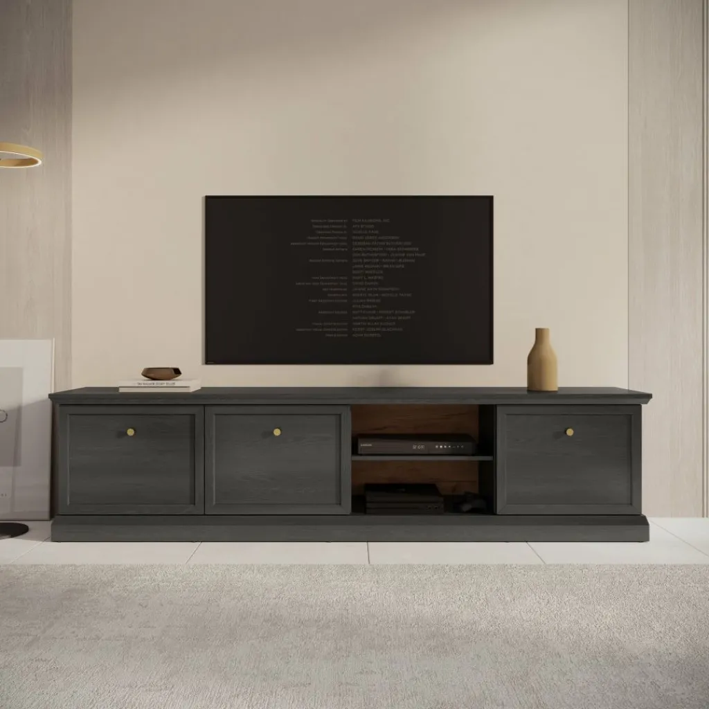TV-Meubel Leroy is een opbergkast voor onder de tv in een landelijke stijl. De TV-kast is gemaakt in een zwart eiken kleur. De Leroy beschikt over 3 deuren die openen met goudkleurige knoppen. Achter deze deuren zitten in totaal 6 opbergvakken. Ook heeft het meubel nog 2 extra open vakken, hier zit in de achterwand een uitsparing om eventuele bedrading weg te werken.