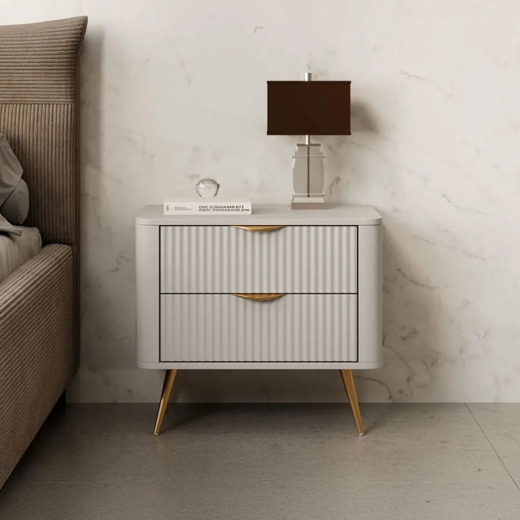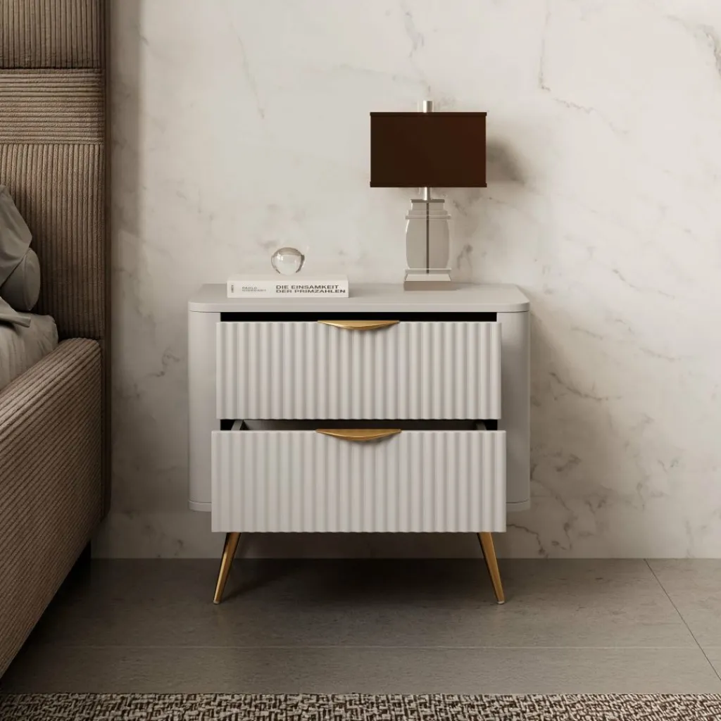 Nachtkastje Lima is een opbergkastje voor naast het bed. De Lima beschikt over 2 lades die met een goudkleurige handgreep te openen zijn. De voorkant van de lades hebben een latten patroon. Het nachtkastje staat op goudkleurige pootjes die gemaakt zijn van metaal.