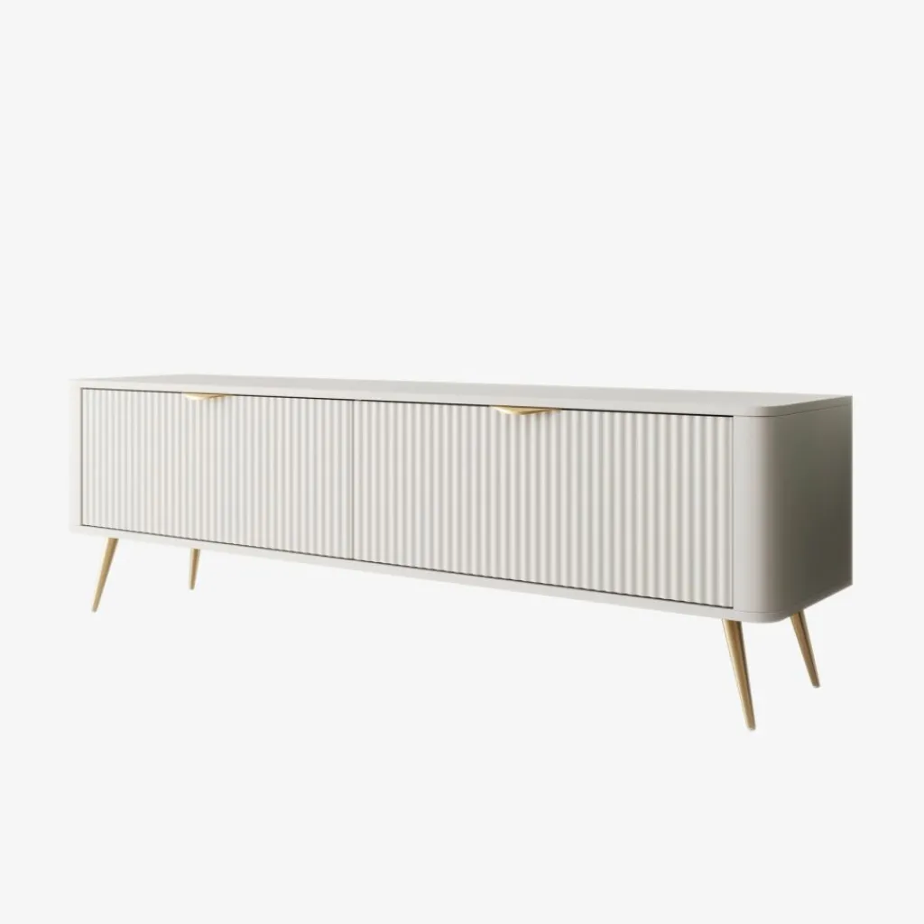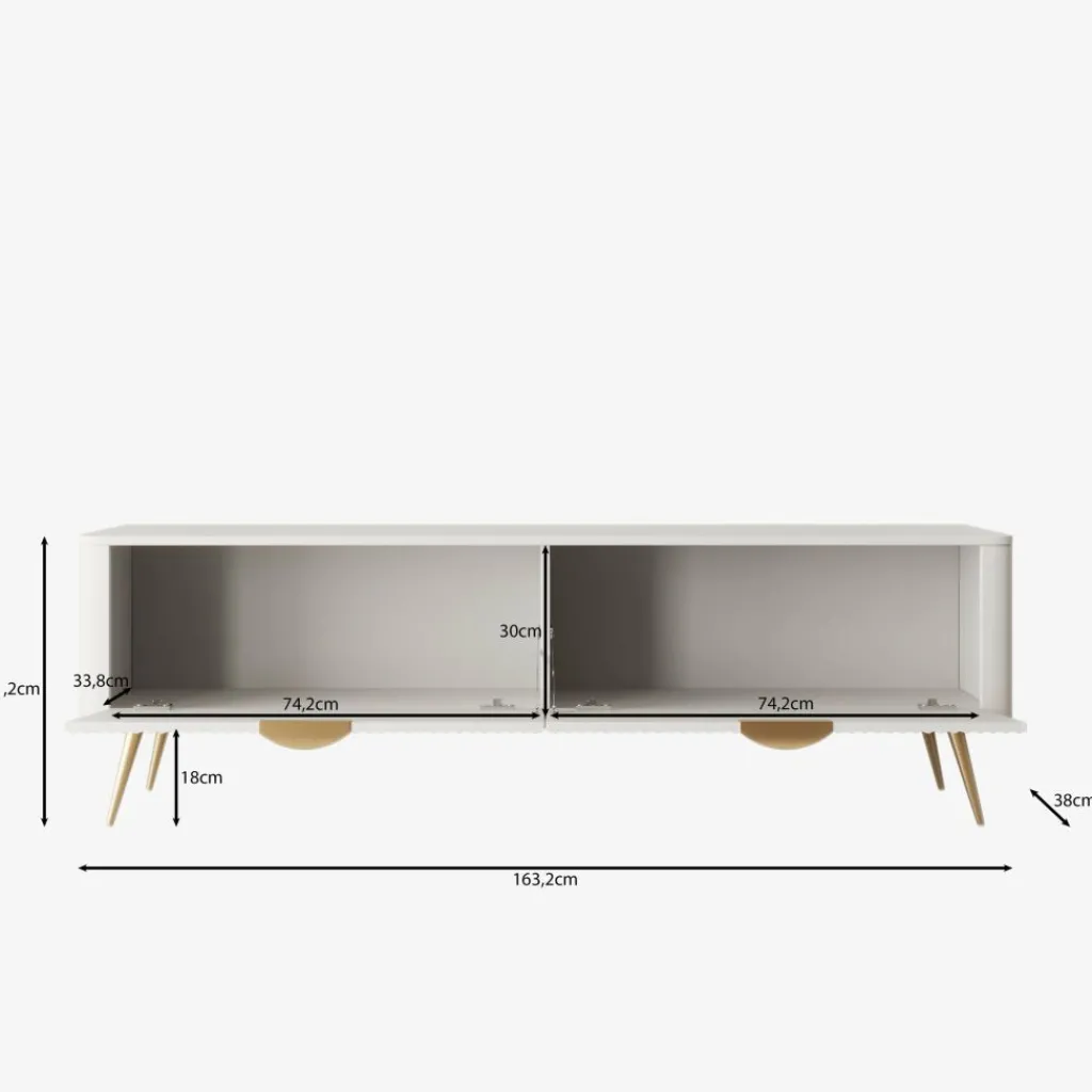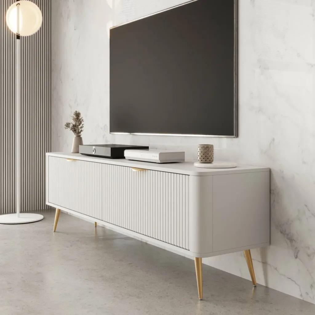 Het Lima TV-meubel in wit heeft een strak en elegant ontwerp met subtiele details. De verticale lijnen op de kleppen, afgeronde hoeken en goudkleurige poten en grepen geven het meubel een verfijnde uitstraling.