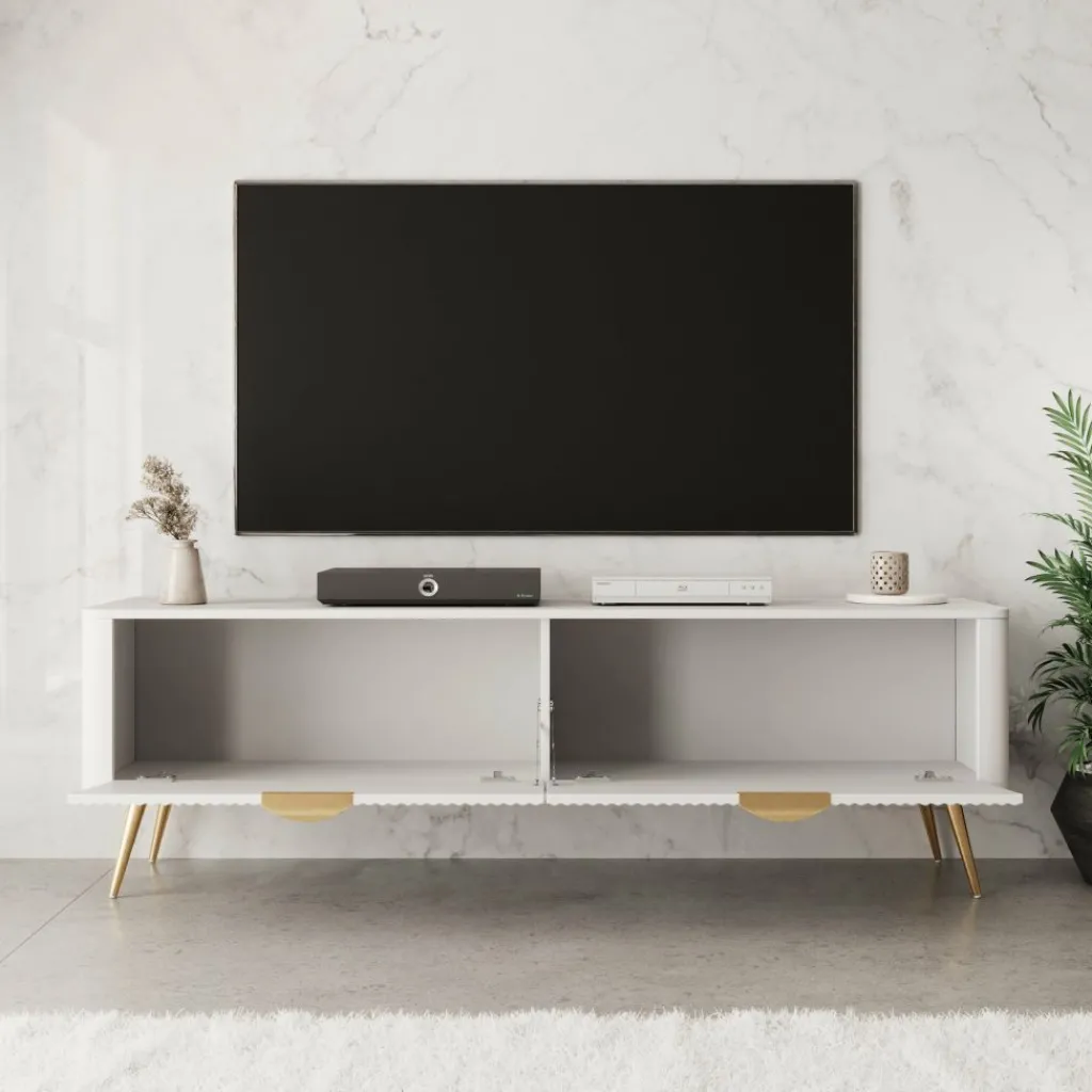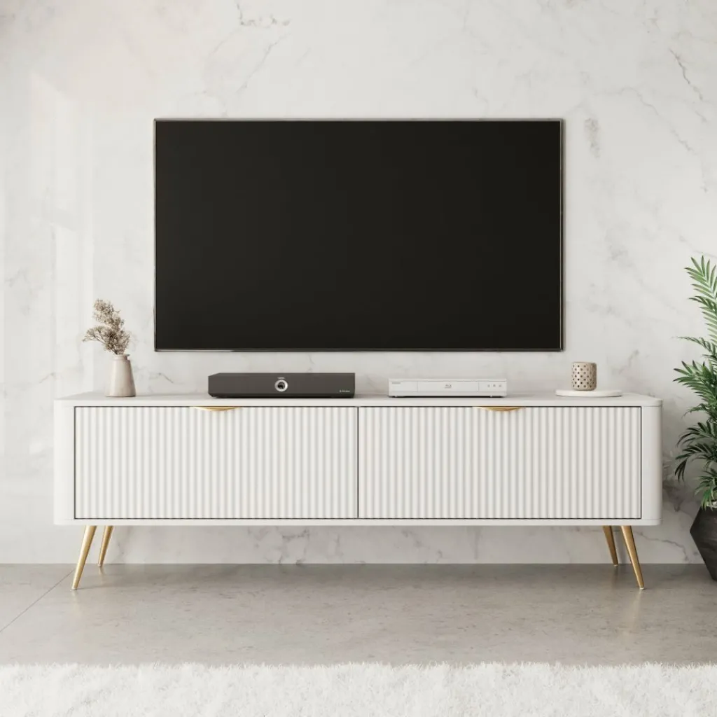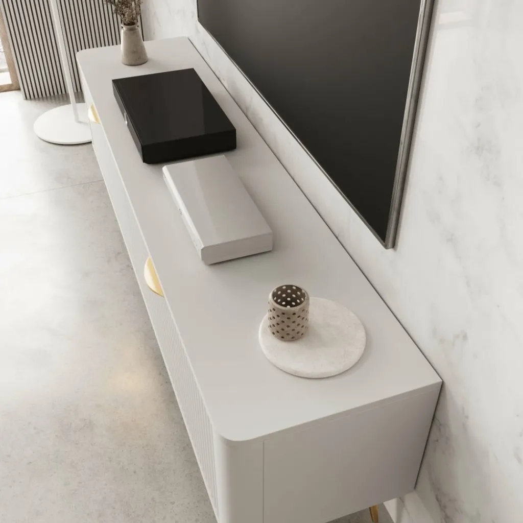 Het Lima TV-meubel in wit heeft een strak en elegant ontwerp met subtiele details. De verticale lijnen op de kleppen, afgeronde hoeken en goudkleurige poten en grepen geven het meubel een verfijnde uitstraling.