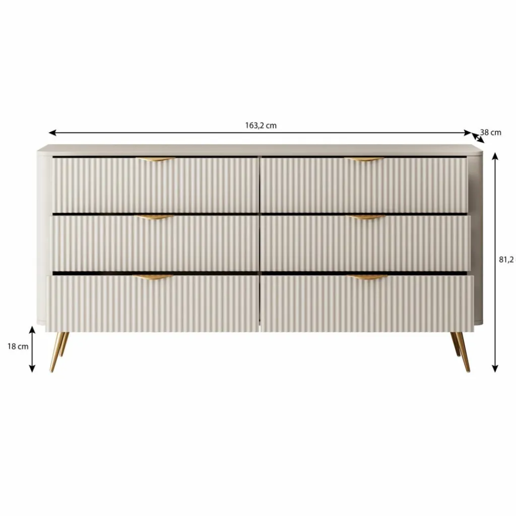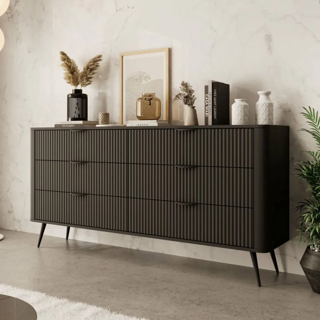 Ladekast Lima is een opbergkast in een hotel chique stijl. Het dressoir staat op metalen poten. De kast beschikt over 6 lades die openen met zwarte handgrepen. De voorkant heeft een latten patroon wat de kast een unieke uitstraling geeft.